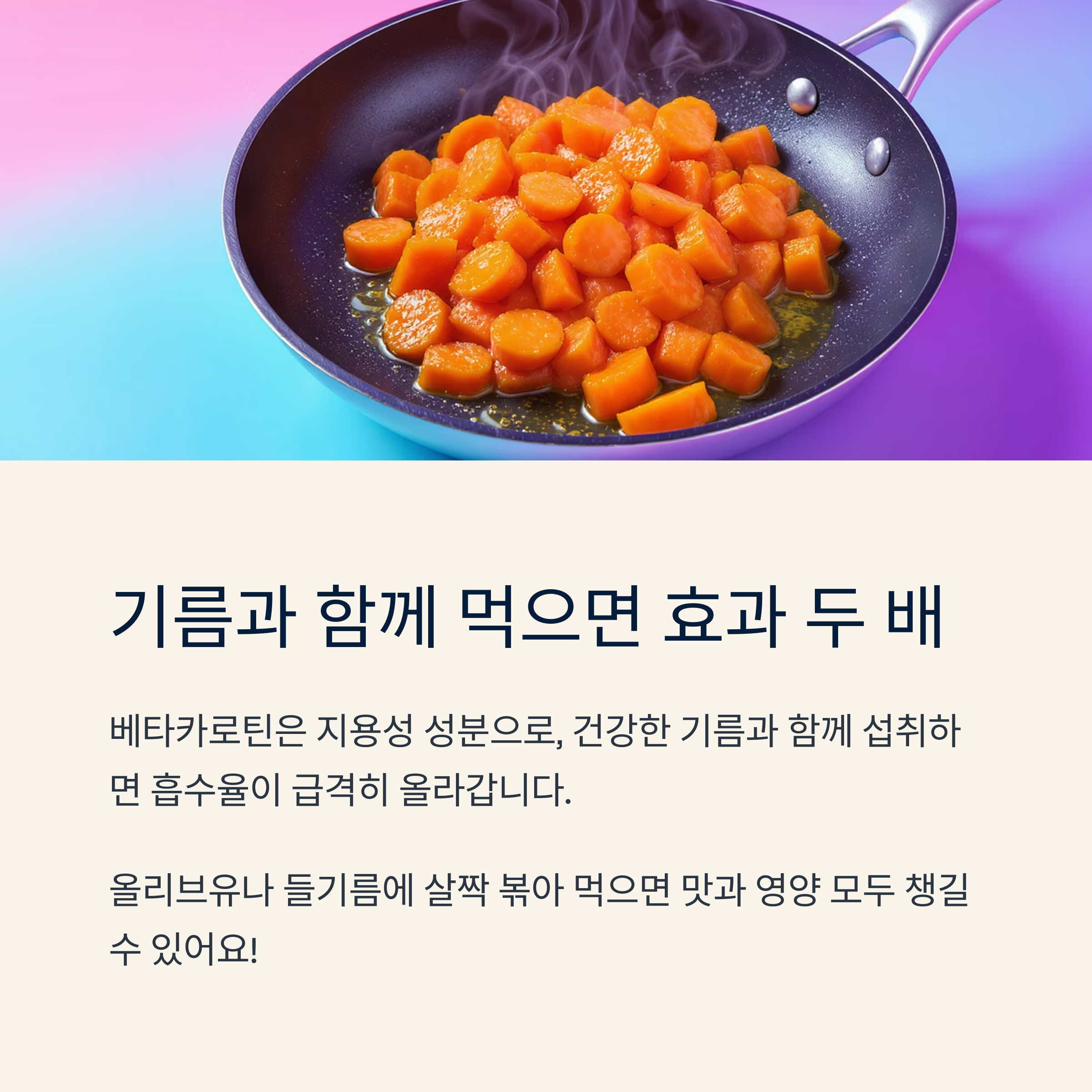 베타카로틴은 지용성 성분으로, 기름과 함께 섭취할 때 흡수율이 급격히 올라갑니다.