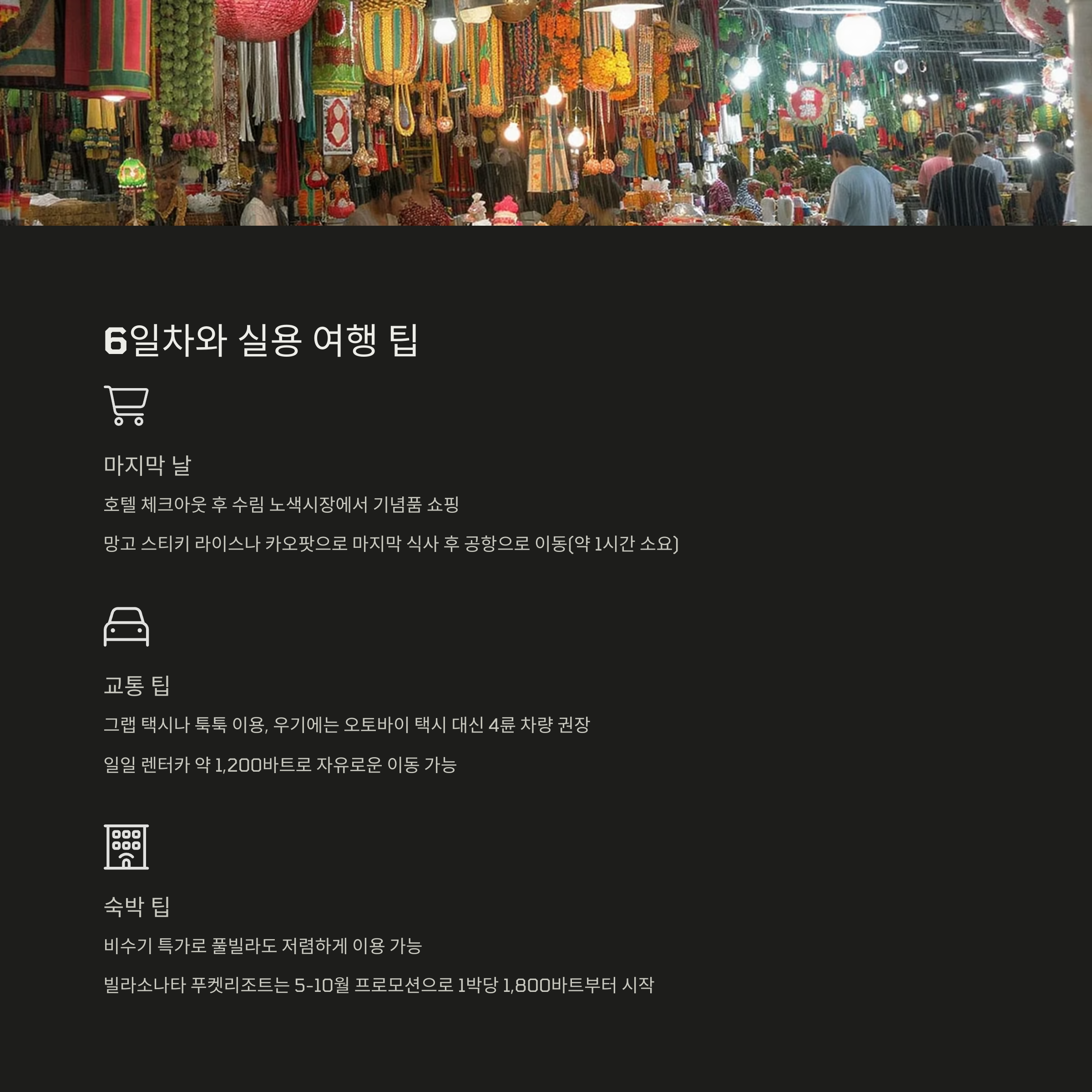 알찬 여행을 위해 매일 일정은 바다, 문화, 실내 활동 등으로 분산 구성하는 것이 좋습니다. 피피섬 스노클링 투어는 맑은 날씨가 예상되는 날에 배치하고, 비가 예보된 날은 워터파크나 쇼핑센터, 마사지 등을 즐기세요. 엘리펀트 샌츄어리와 같은 체험형 활동도 날씨의 영향을 적게 받아 전반적인 일정 흐름을 안정적으로 유지할 수 있습니다.