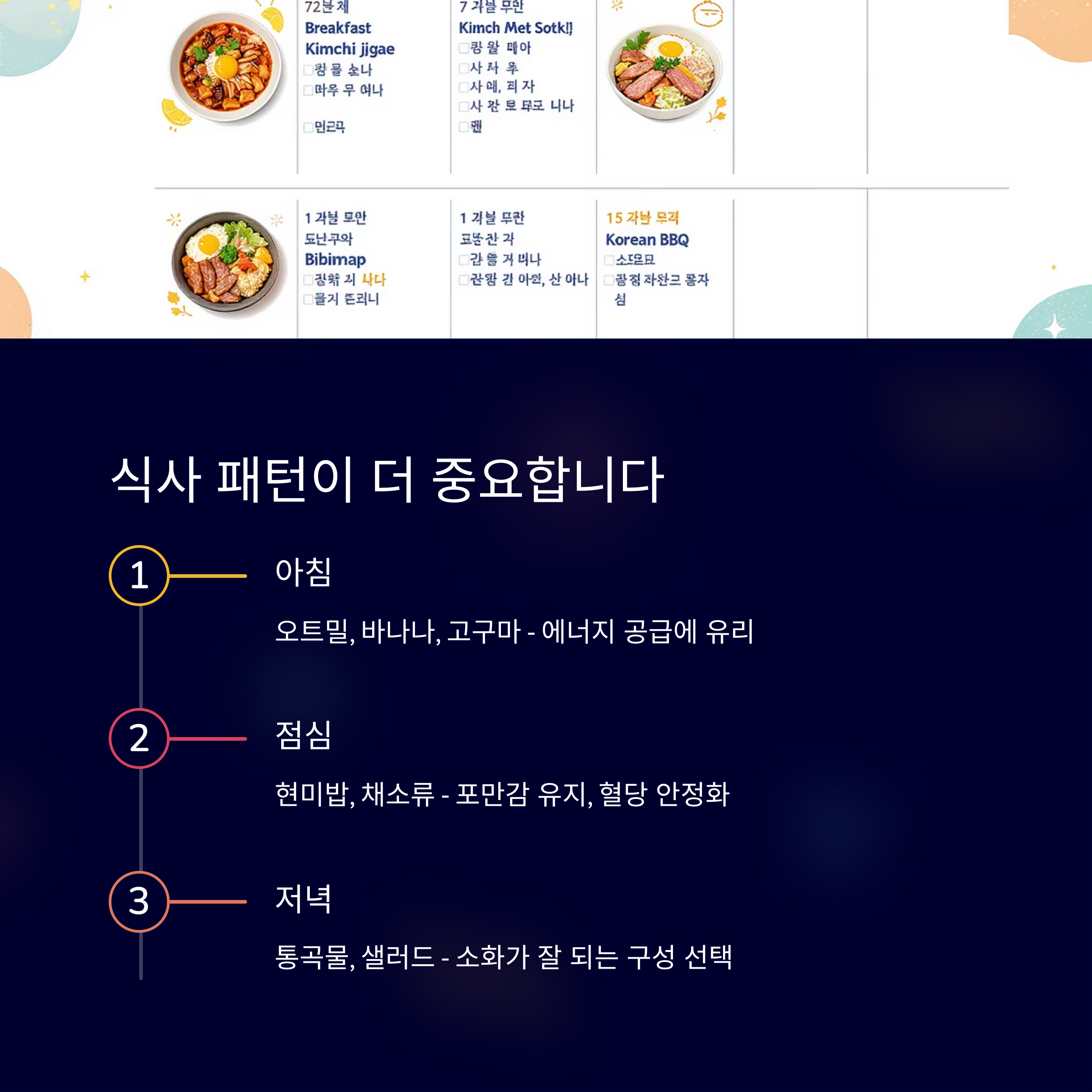 | 저녁 | 통곡물, 샐러드 | 소화가 잘 되는 구성 선택 |