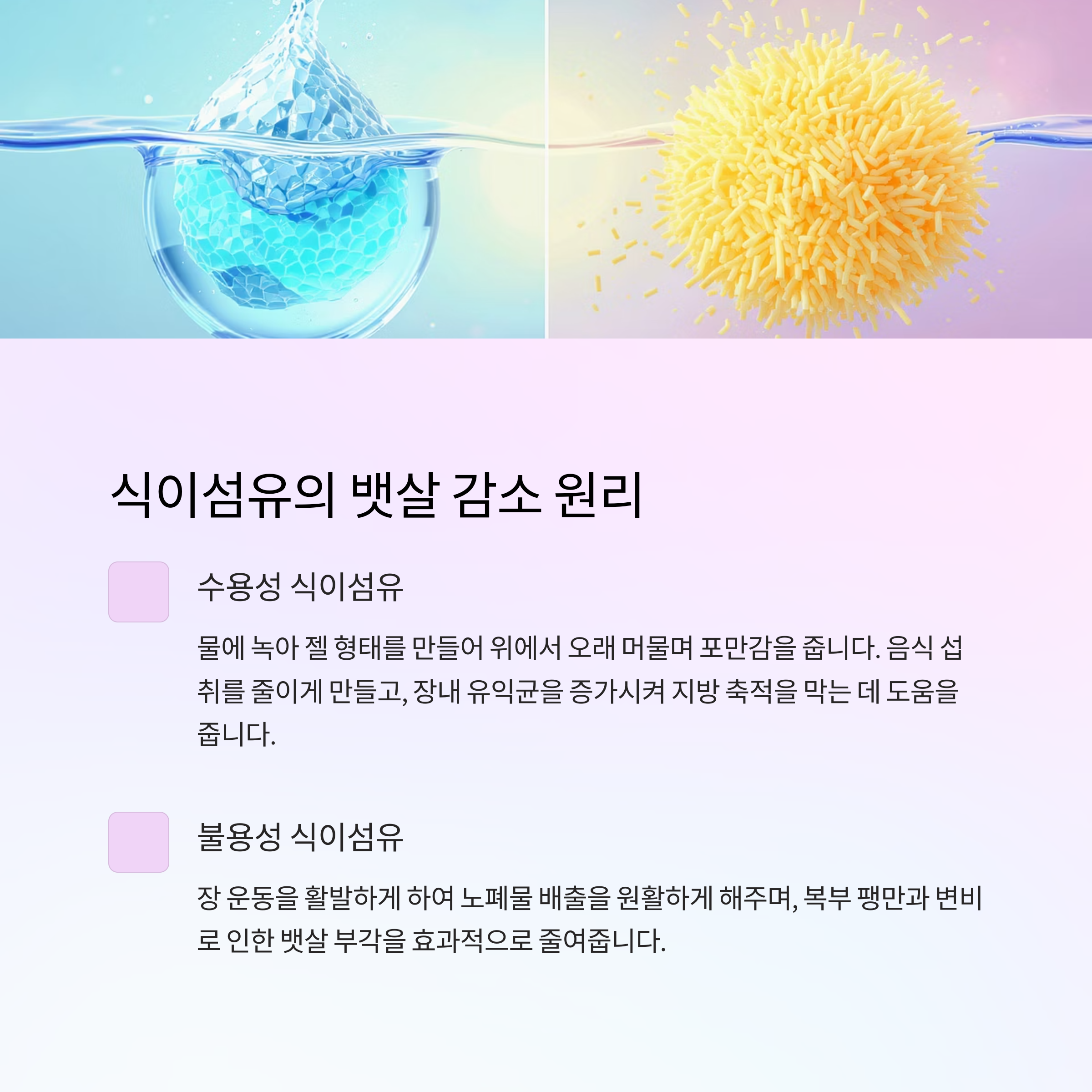 식이섬유는 수용성과 불용성 두 가지가 있습니다. 수용성 식이섬유는 물에 녹아 젤 형태를 만들고,