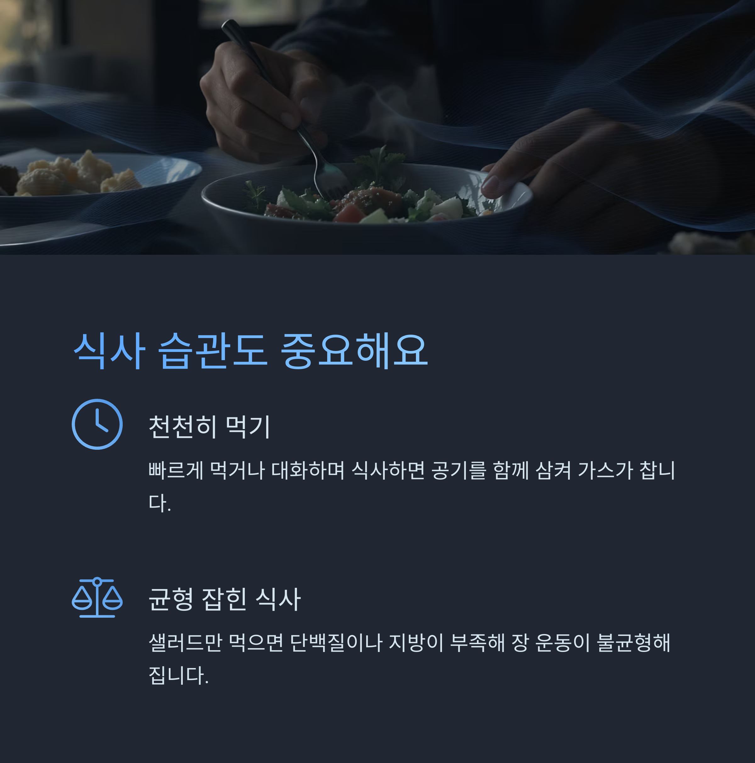 저가스 채소 위주로 식단을 구성하는 것이 좋습니다.