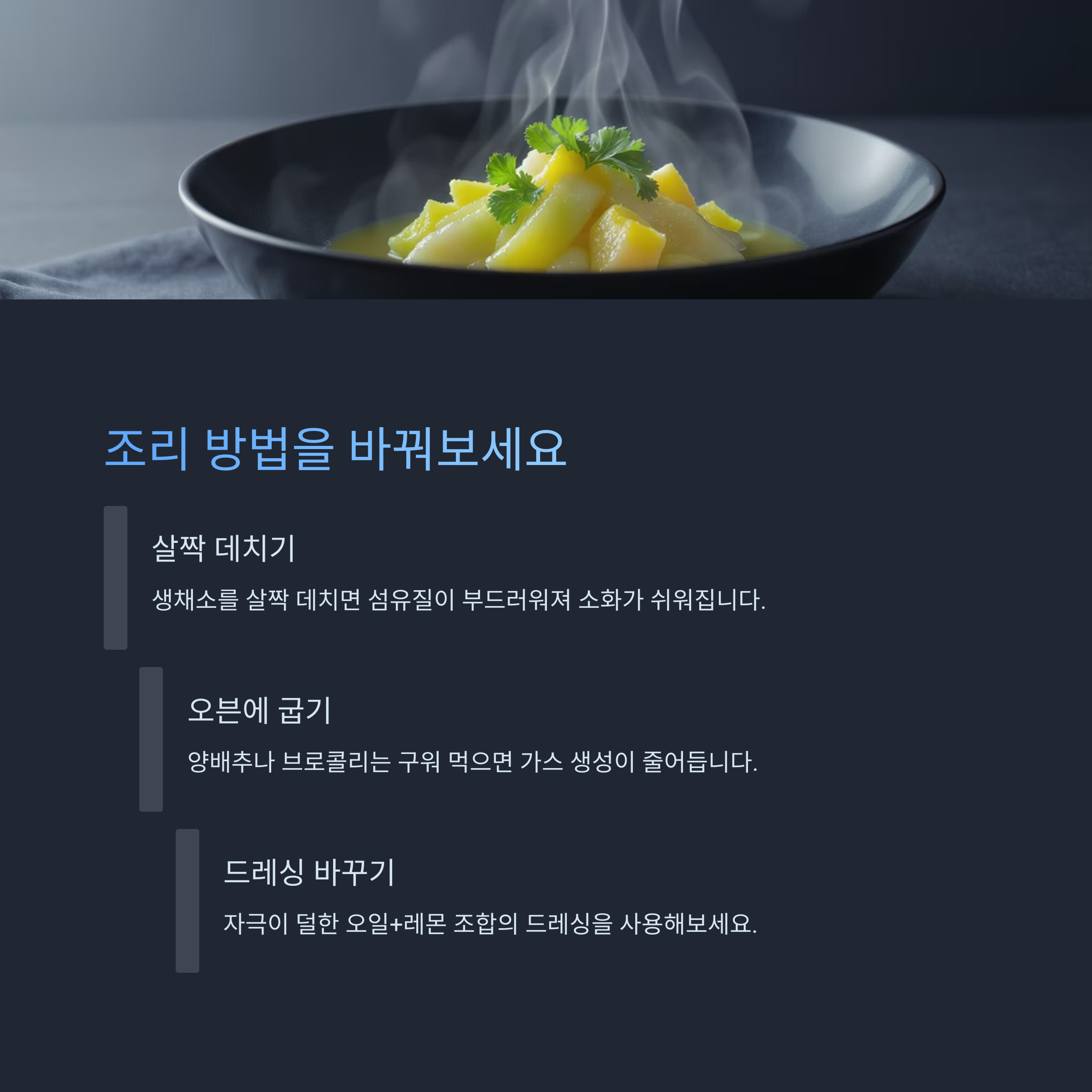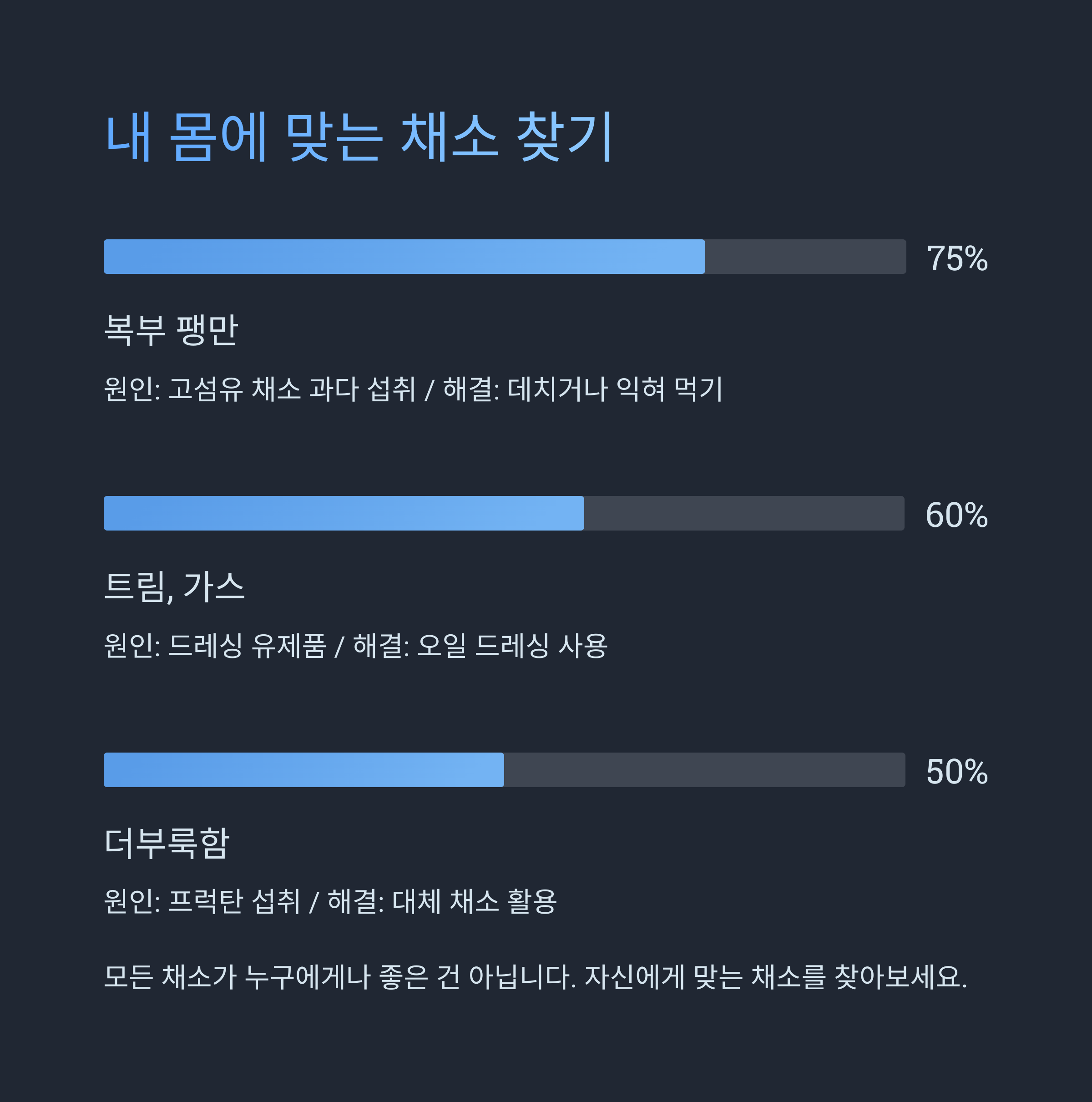 | 복부 팽만 | 고섬유 채소 과다 섭취 | 데치거나 익혀 먹기 |