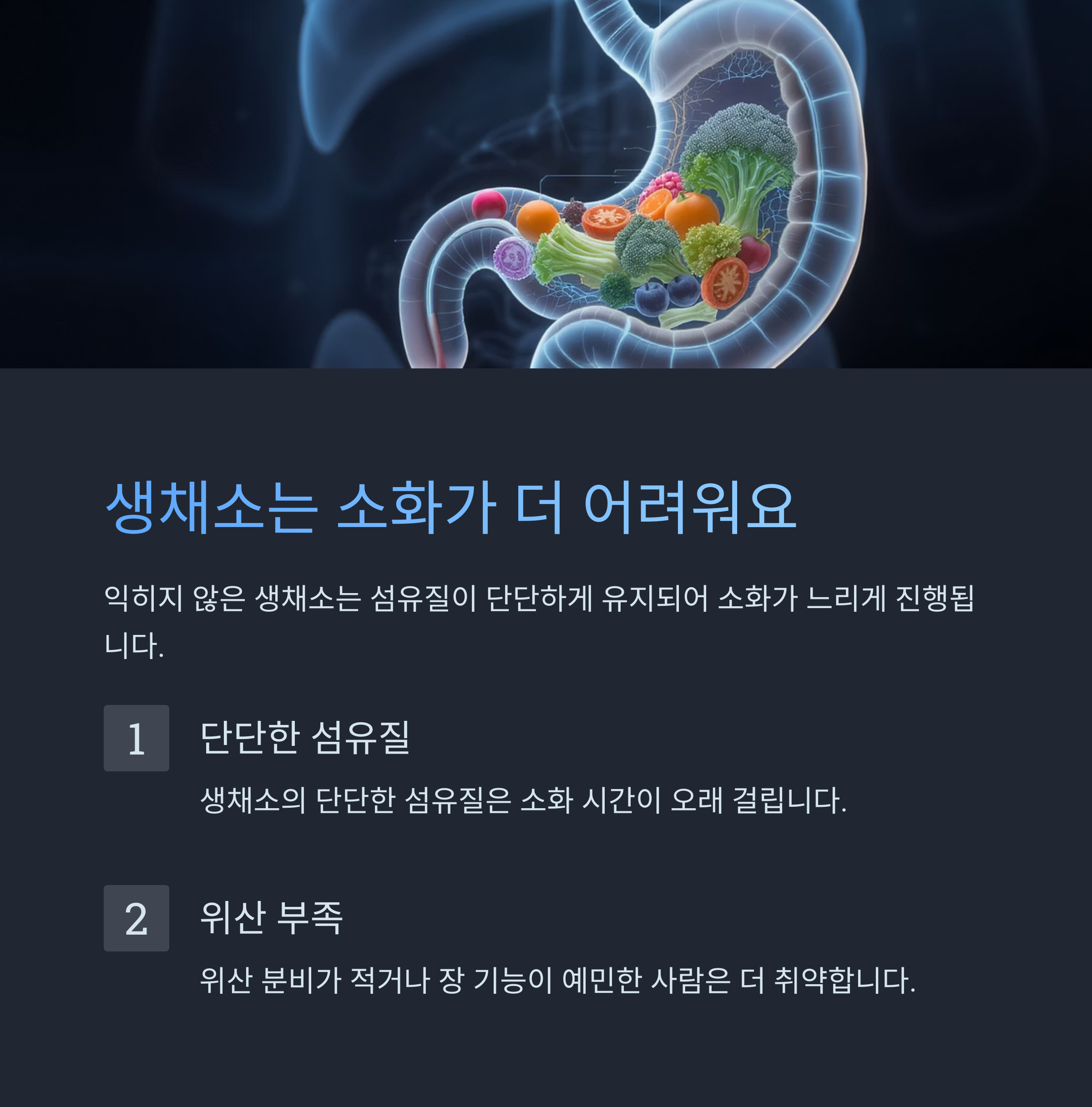 익히지 않은 생채소는 섬유질이 단단하게 유지되어 소화가 느리게