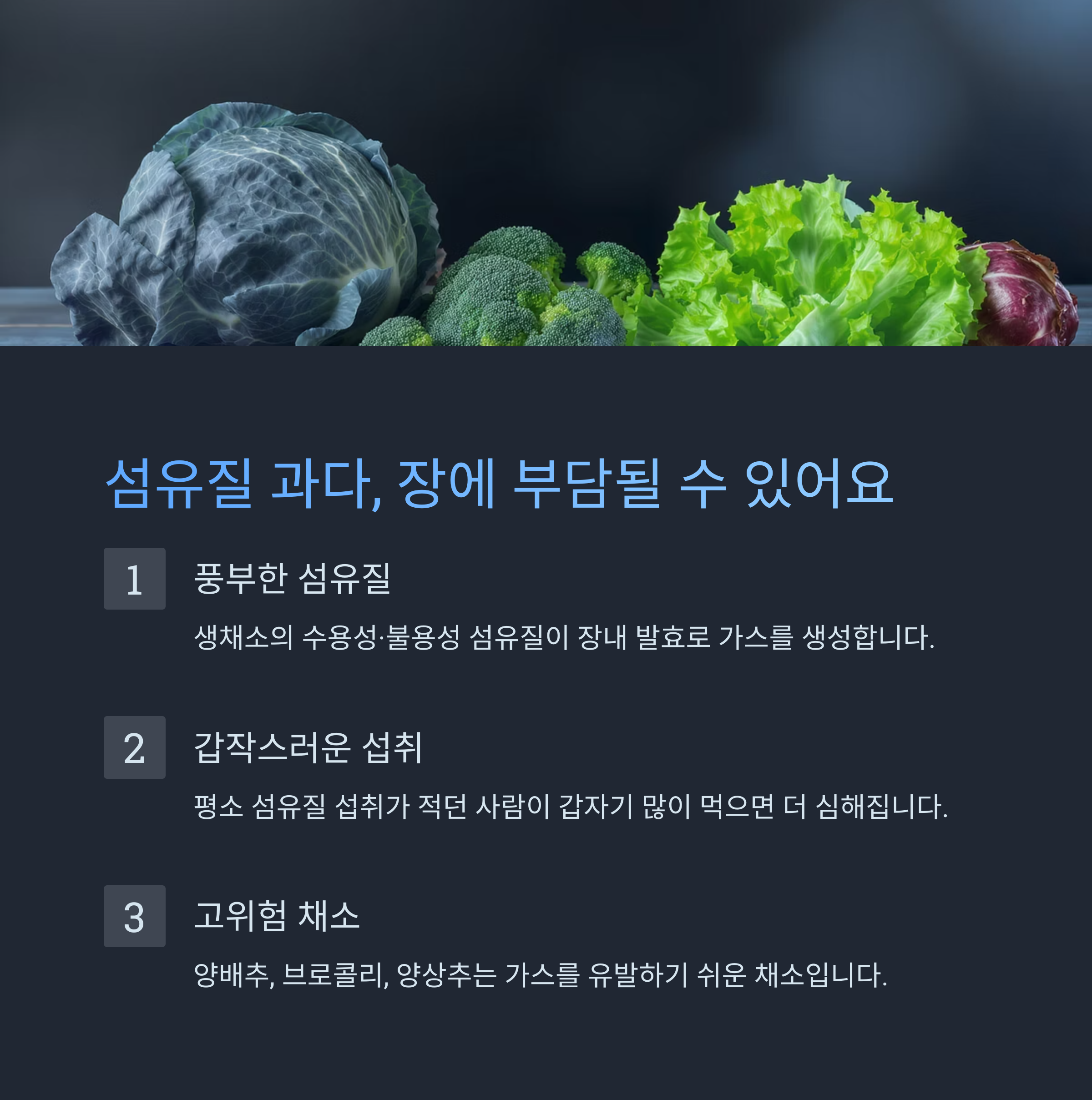 복부 팽만 고섬유 채소 과다 섭취 데치거나 익혀 먹기