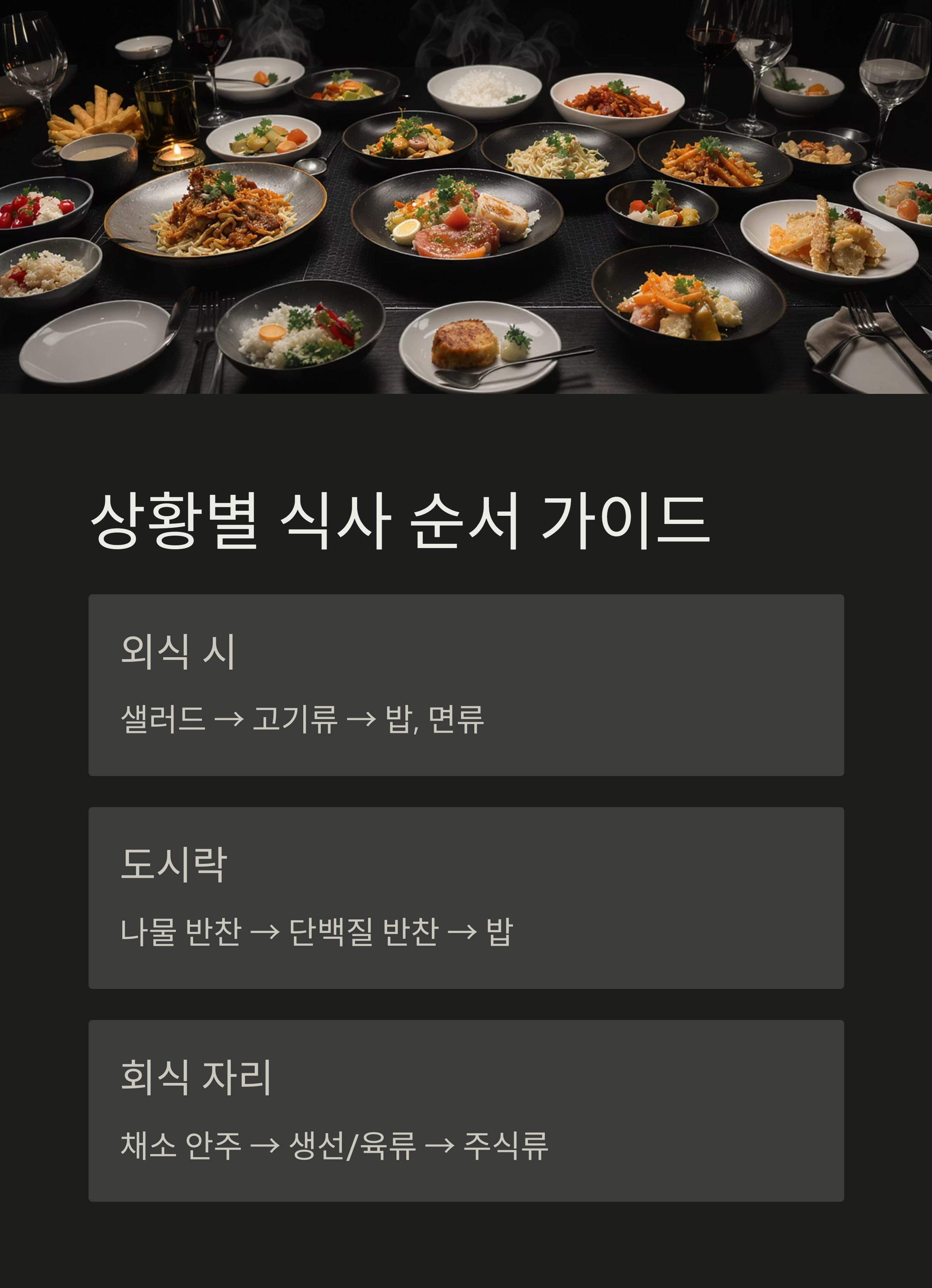 예를 들어, 백반 한 상을 먹을 경우 아래와 같이 순서를 구성해 보세요.