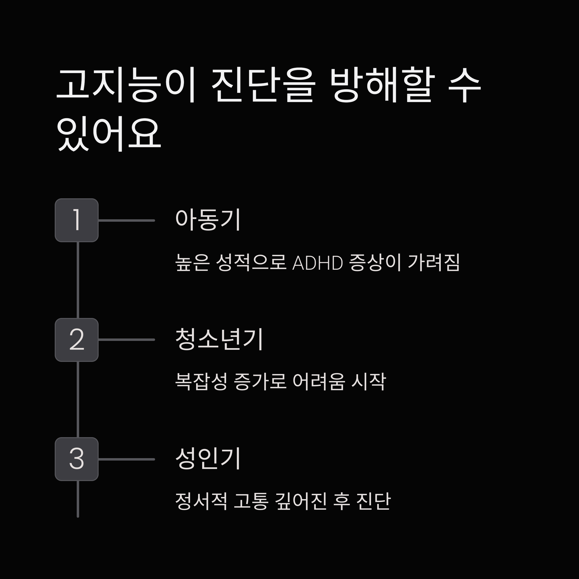 이들은 지능이 높지만 주의력 결핍, 과잉행동, 충동성 같은 전형적 증상이 나타납니다.