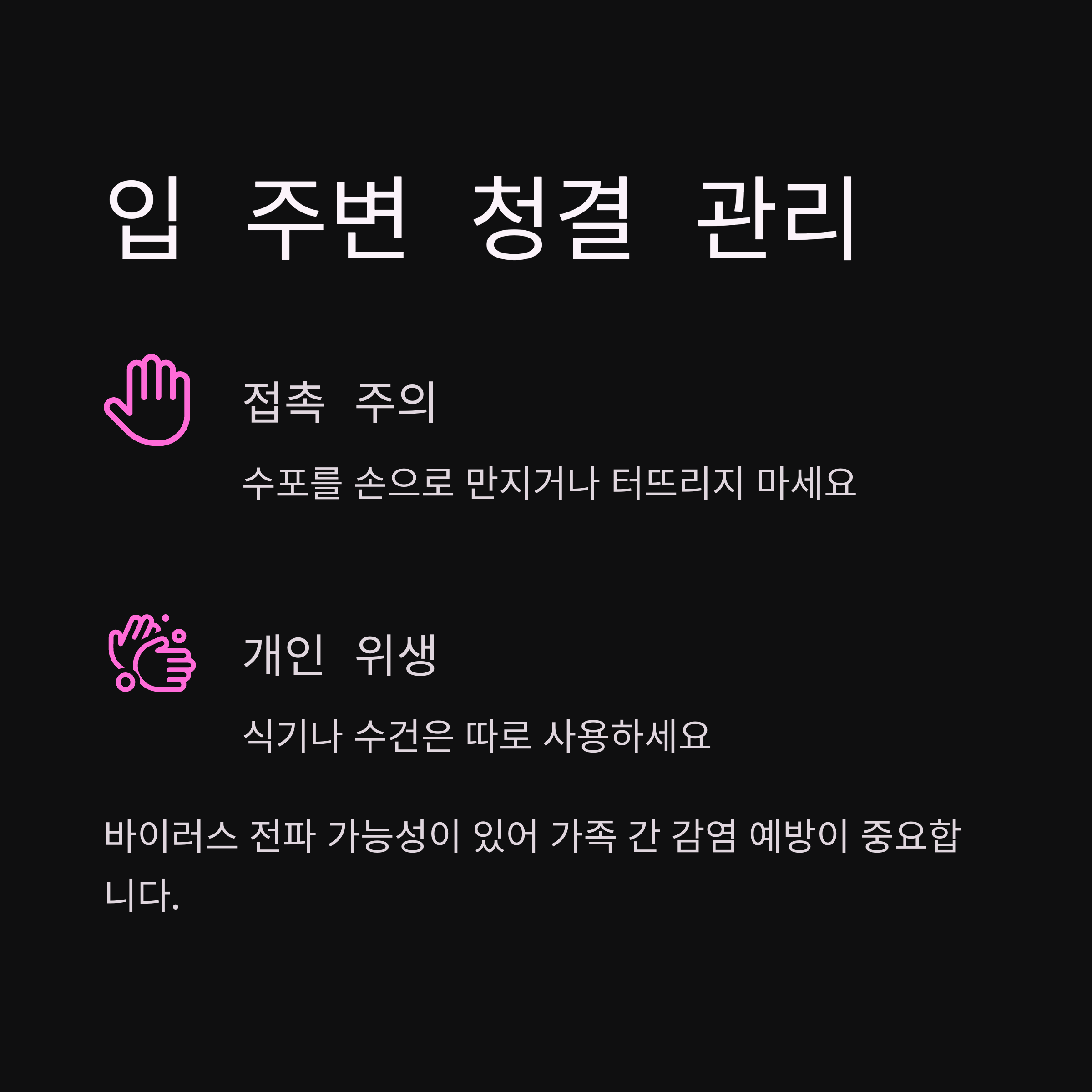 입 주변 청결과 접촉 주의도 필요합니다