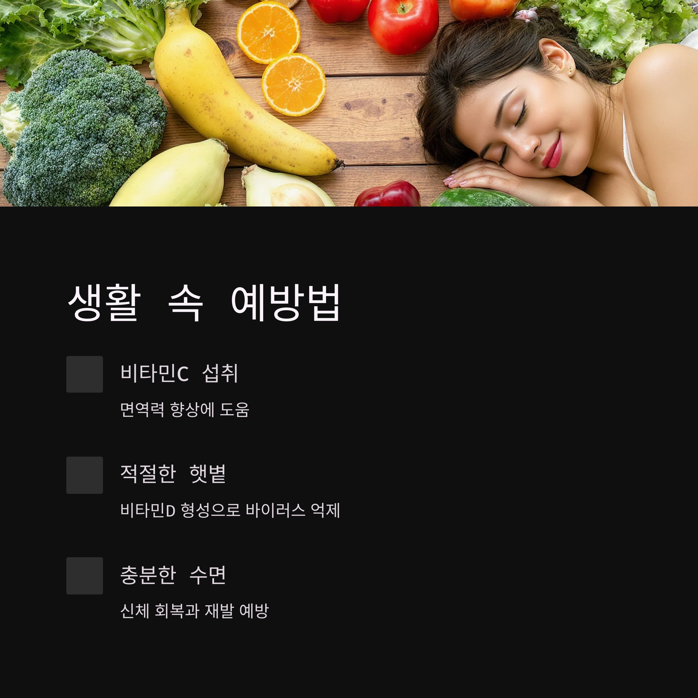 따라서 일상에서 면역력을 높이는 생활 습관이 필수입니다.