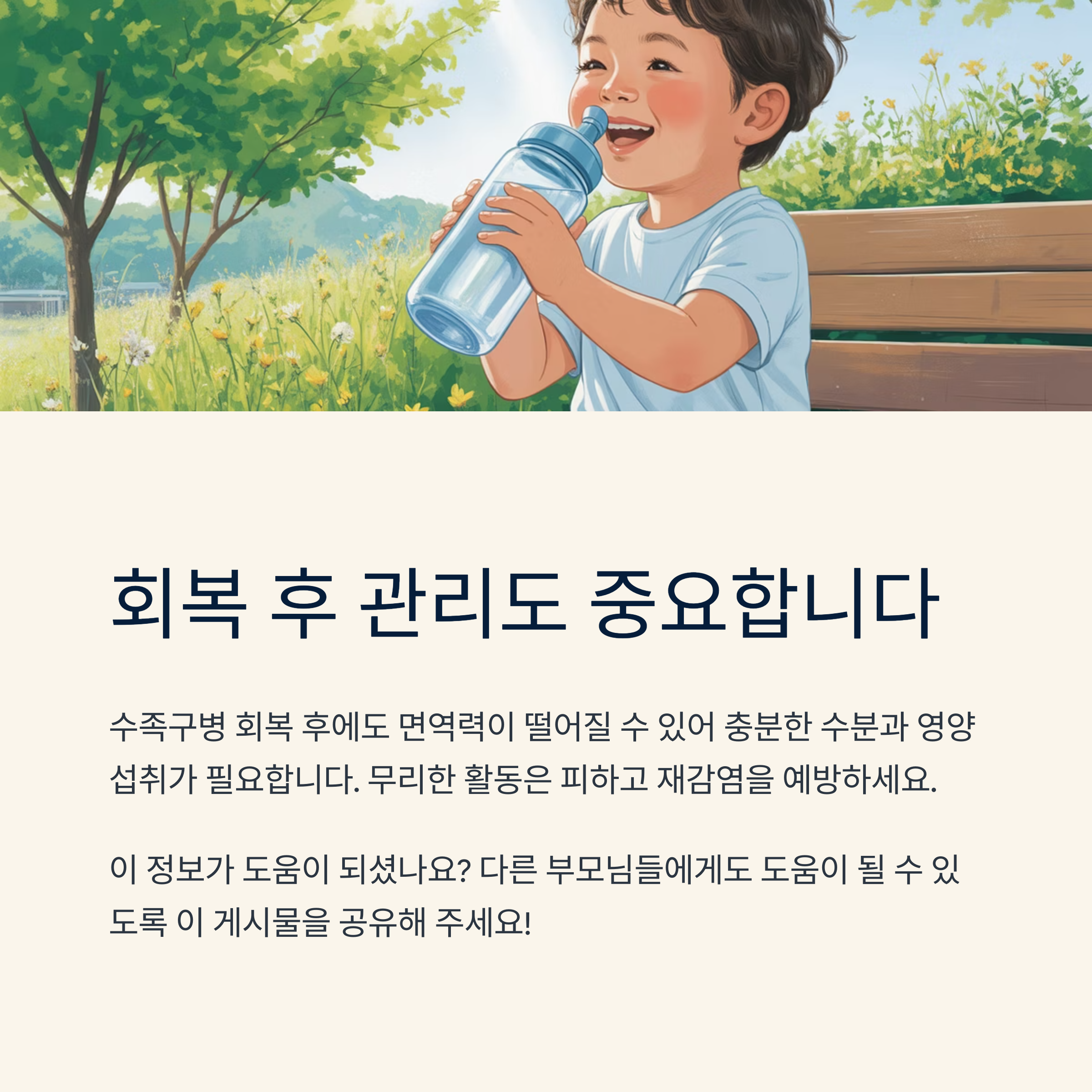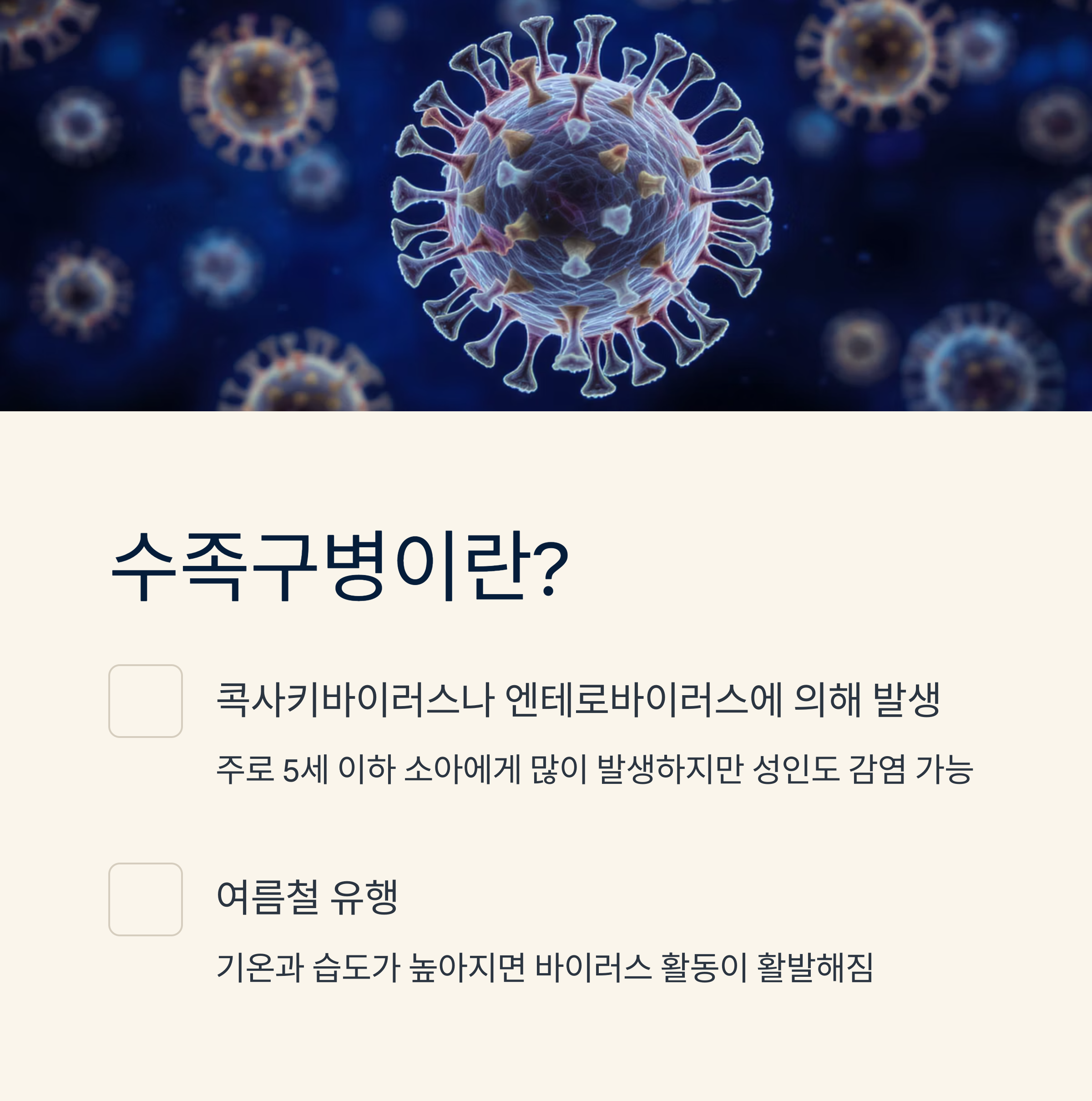 여름철이 되면 어린이집이나 유치원에서 빠르게 번지는 수족구병, 단순한 열성 질환이 아니라 아이들의 건강에 위협이 될 수 있는 바이러스성 질병입니다. 본 글에서는 수족구병의 원인과 전염 경로, 잠복기, 주요 증상, 예방법까지 한눈에 파악할 수 있도록 정리했습니다. 부모님뿐 아니라 보육교사, 교사분들께서도 꼭 알고 계셔야 할 필수 정보입니다.