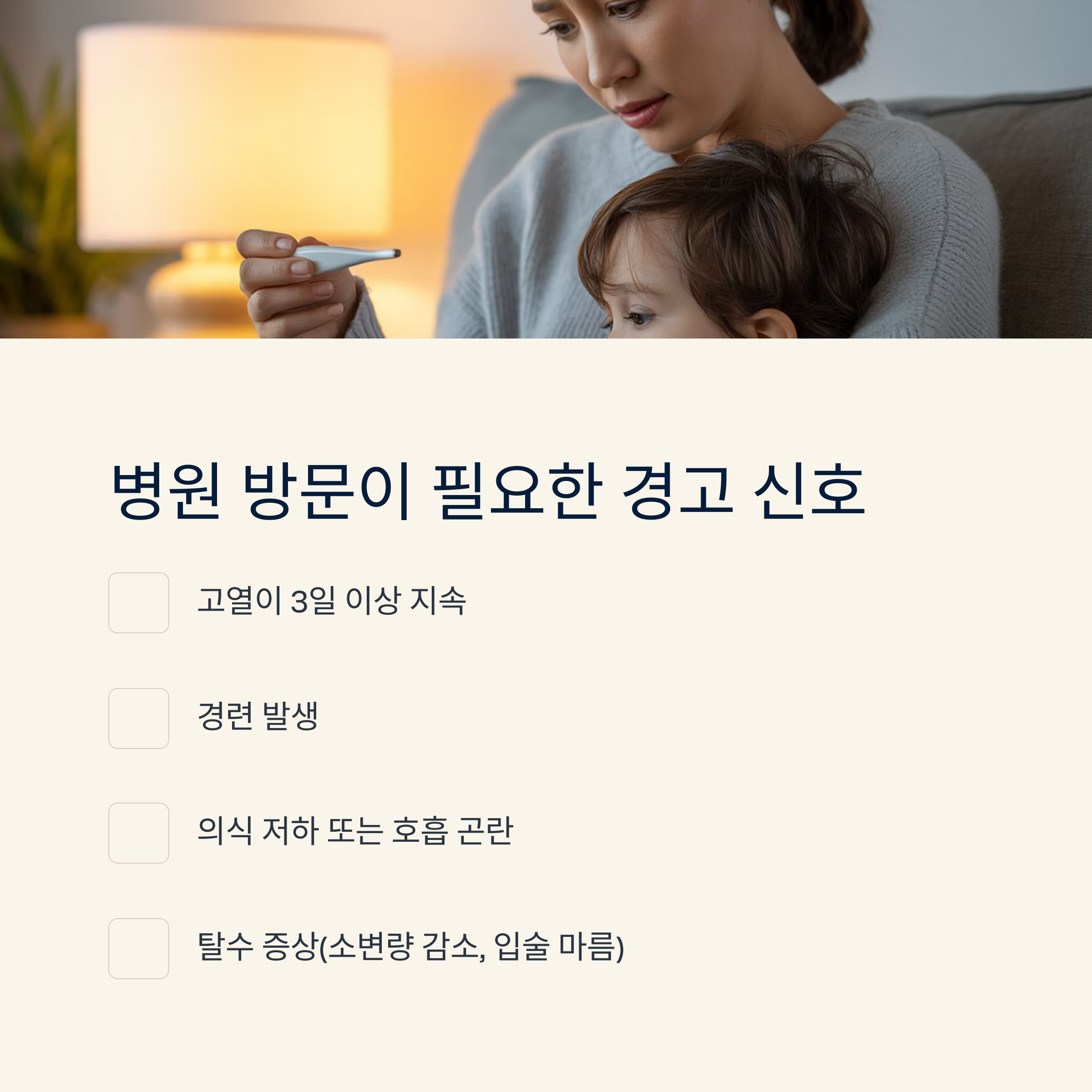 고열이 3일 이상 지속될 때, 경련이 나타날 때, 아이가 의식이 흐려지거나
