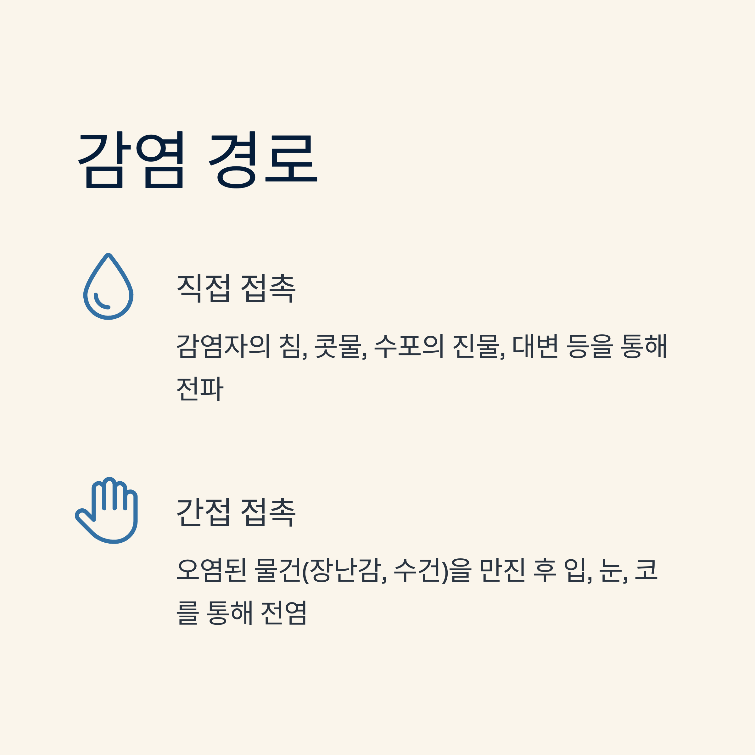 감염자의 손이나 장난감, 수건 등 오염된 물건을 만진 후 입이나 눈,