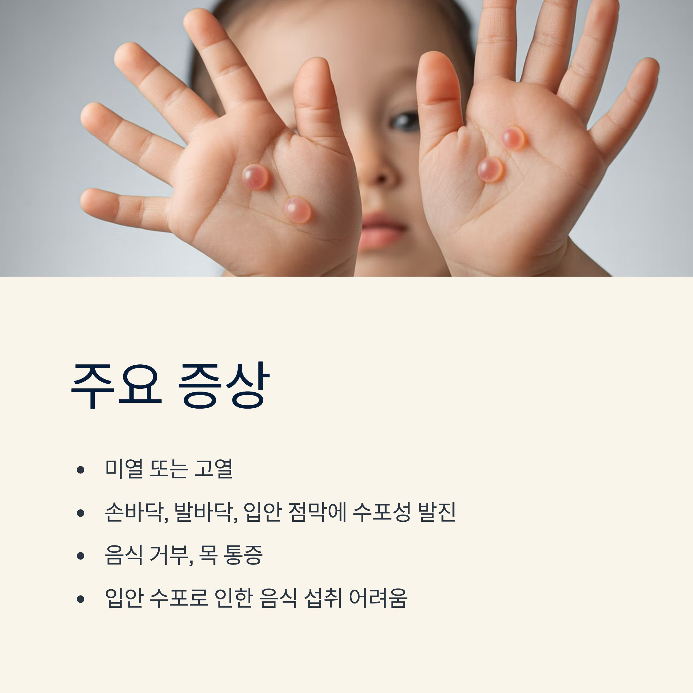| 주요증상 | 손·발·입안의 발진과 수포 |