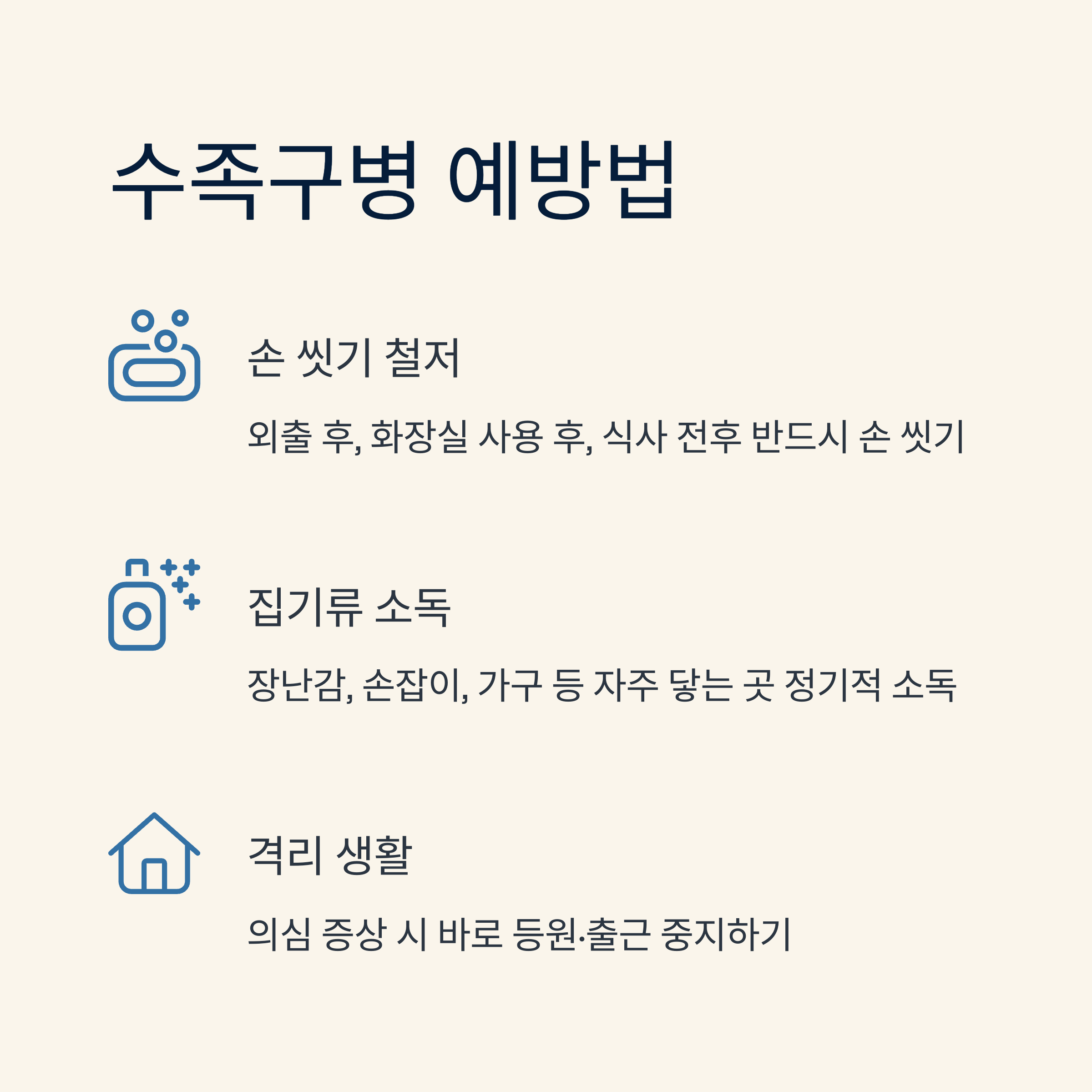 여름철이 되면 어린이집이나 유치원에서 빠르게 번지는 수족구병, 단순한 열성 질환이 아니라 아이들의 건강에 위협이 될 수 있는 바이러스성 질병입니다. 본 글에서는 수족구병의 원인과 전염 경로, 잠복기, 주요 증상, 예방법까지 한눈에 파악할 수 있도록 정리했습니다. 부모님뿐 아니라 보육교사, 교사분들께서도 꼭 알고 계셔야 할 필수 정보입니다.