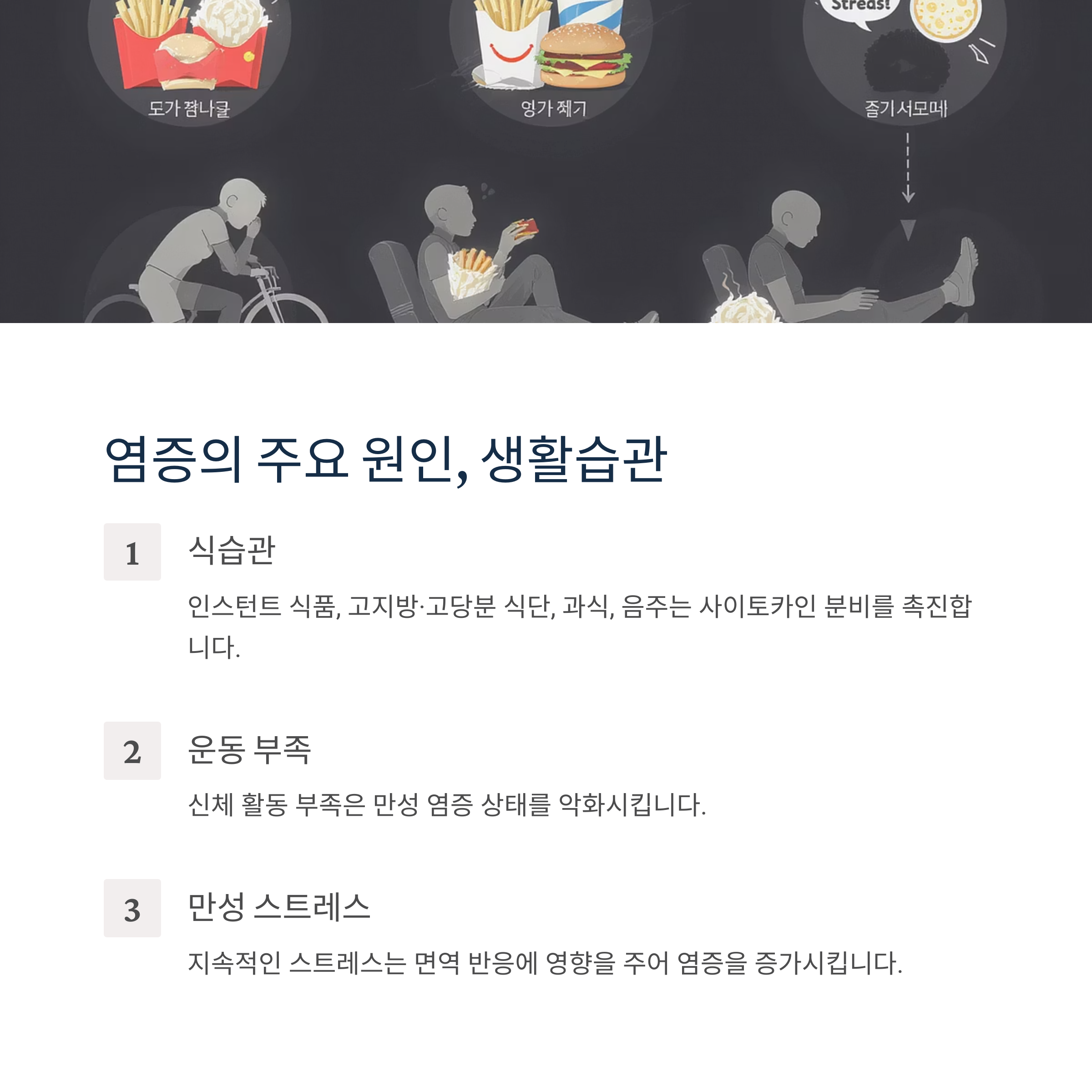 이러한 습관을 중단하는 것만으로도 염증 지표는 현저히 낮아질 수 있습니다.
