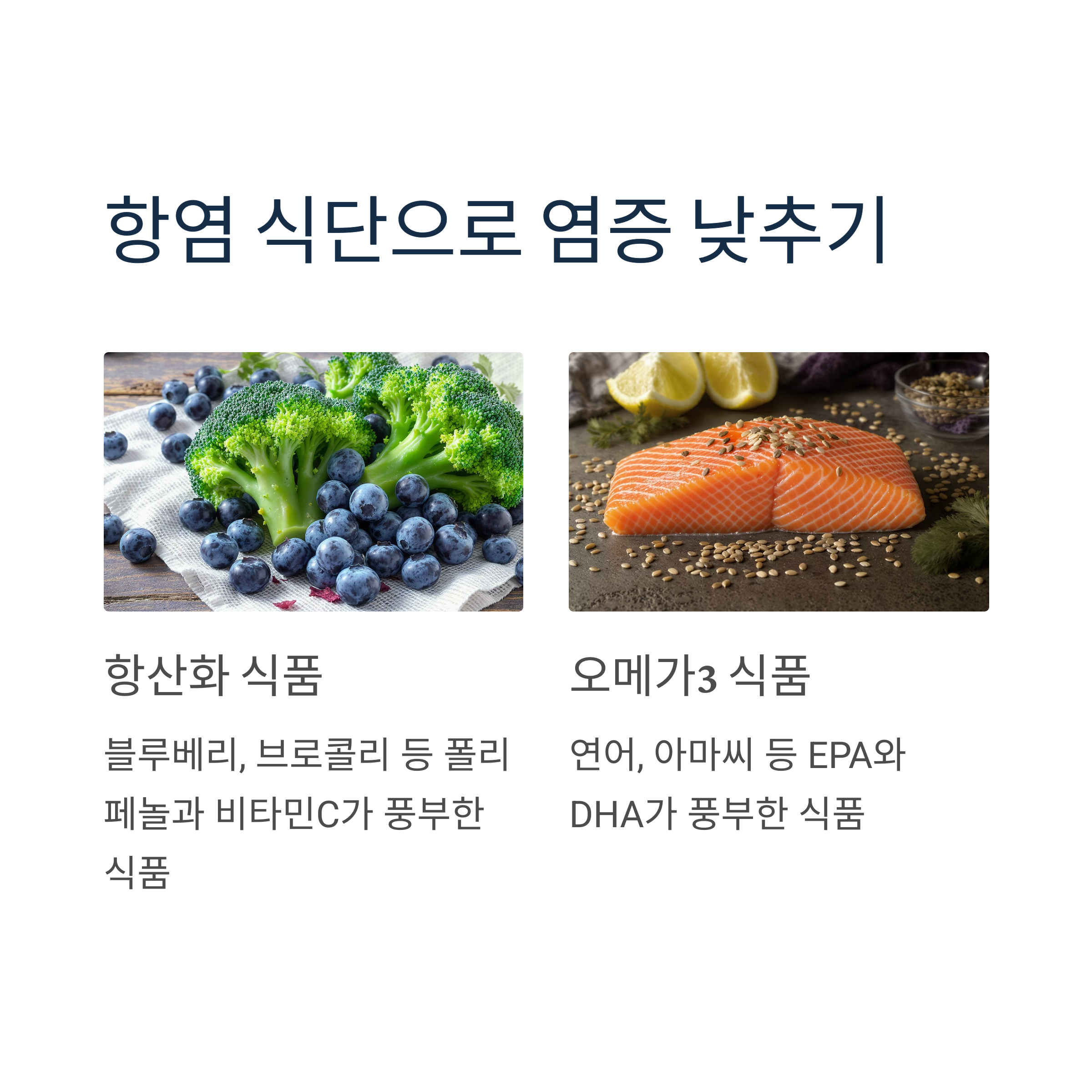 염증을 낮추는 데 도움이 되는 항산화 식품과 오메가3가 풍부한 식단을 추천드립니다.