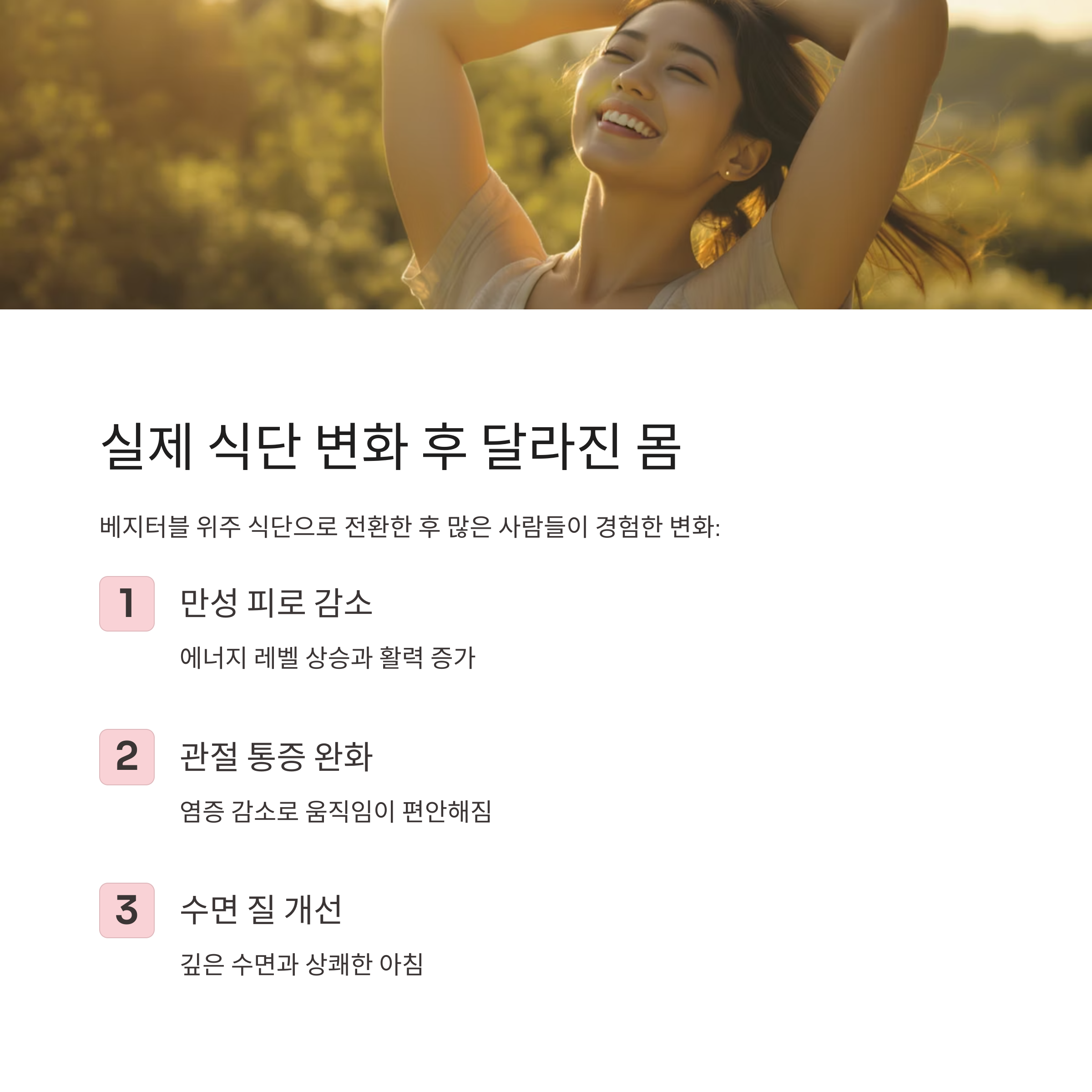 베지터블 위주 식단으로 전환한 후 통증이 줄고 수면 질이 좋아졌다는 이야기도 많습니다.