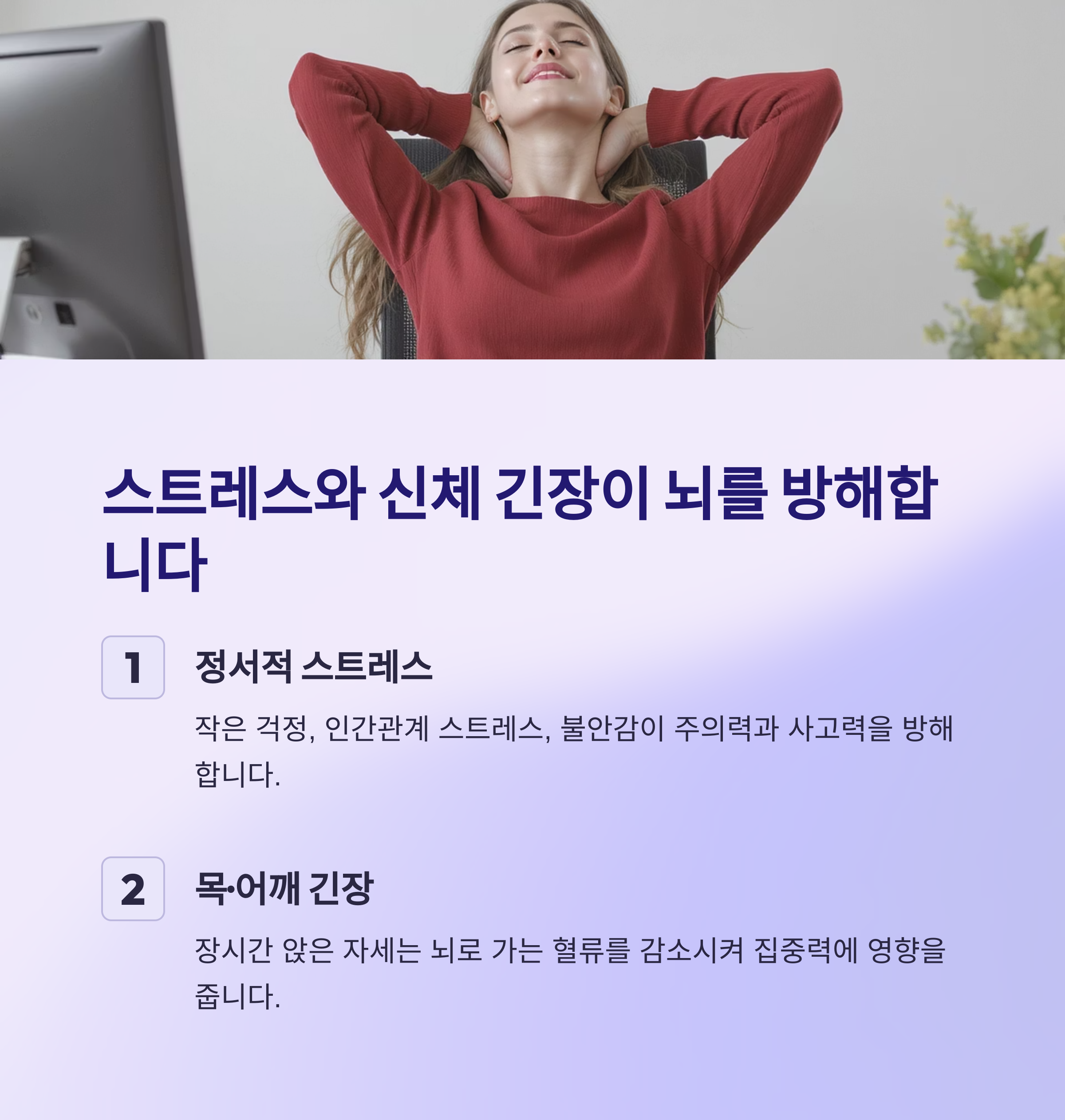 눈에 보이지 않는 정서적 스트레스도 집중력 저하의 은근한 원인입니다.