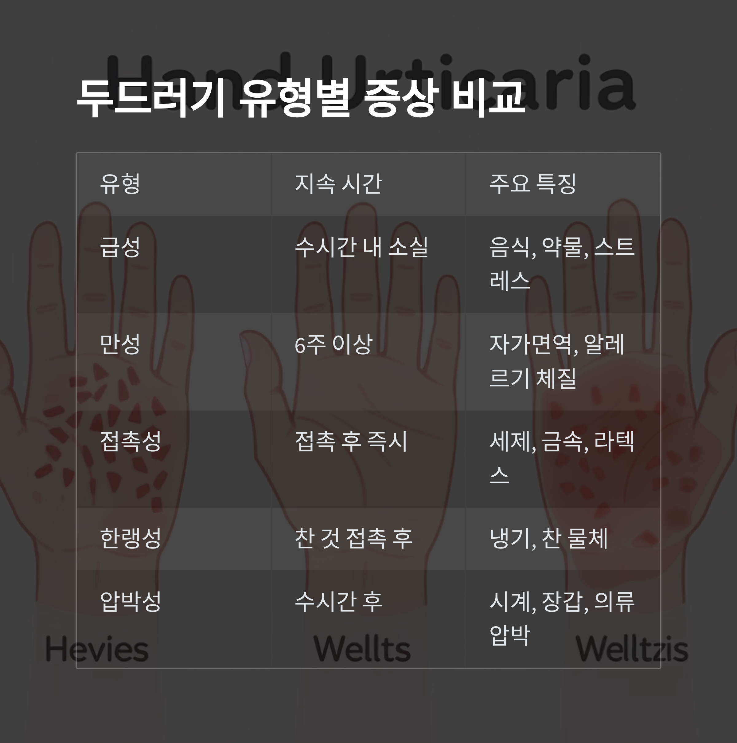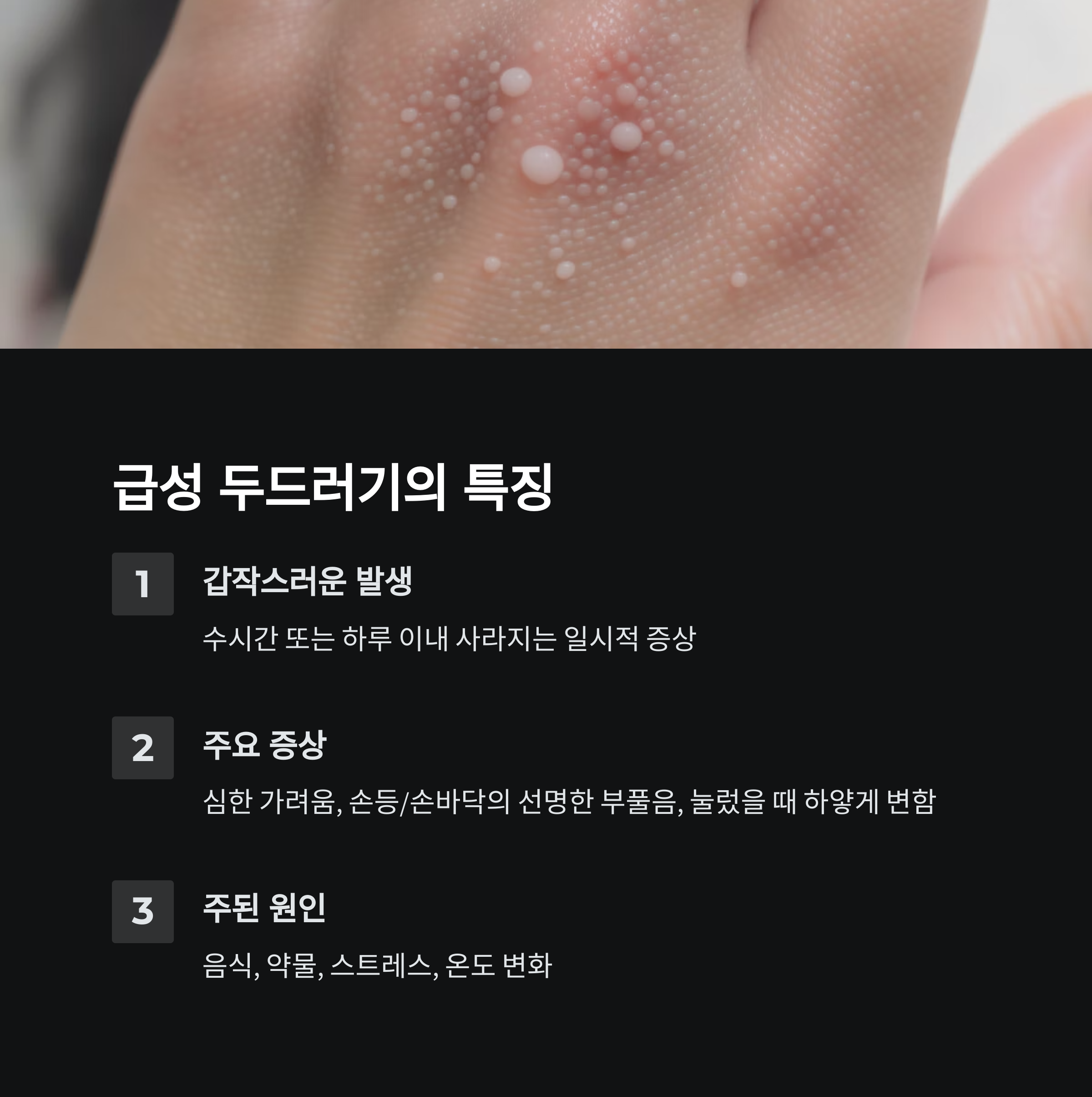 급성 두드러기 | 수시간 내 사라짐 | 전신, 손 포함 | 음식, 약물, 스트레스 |