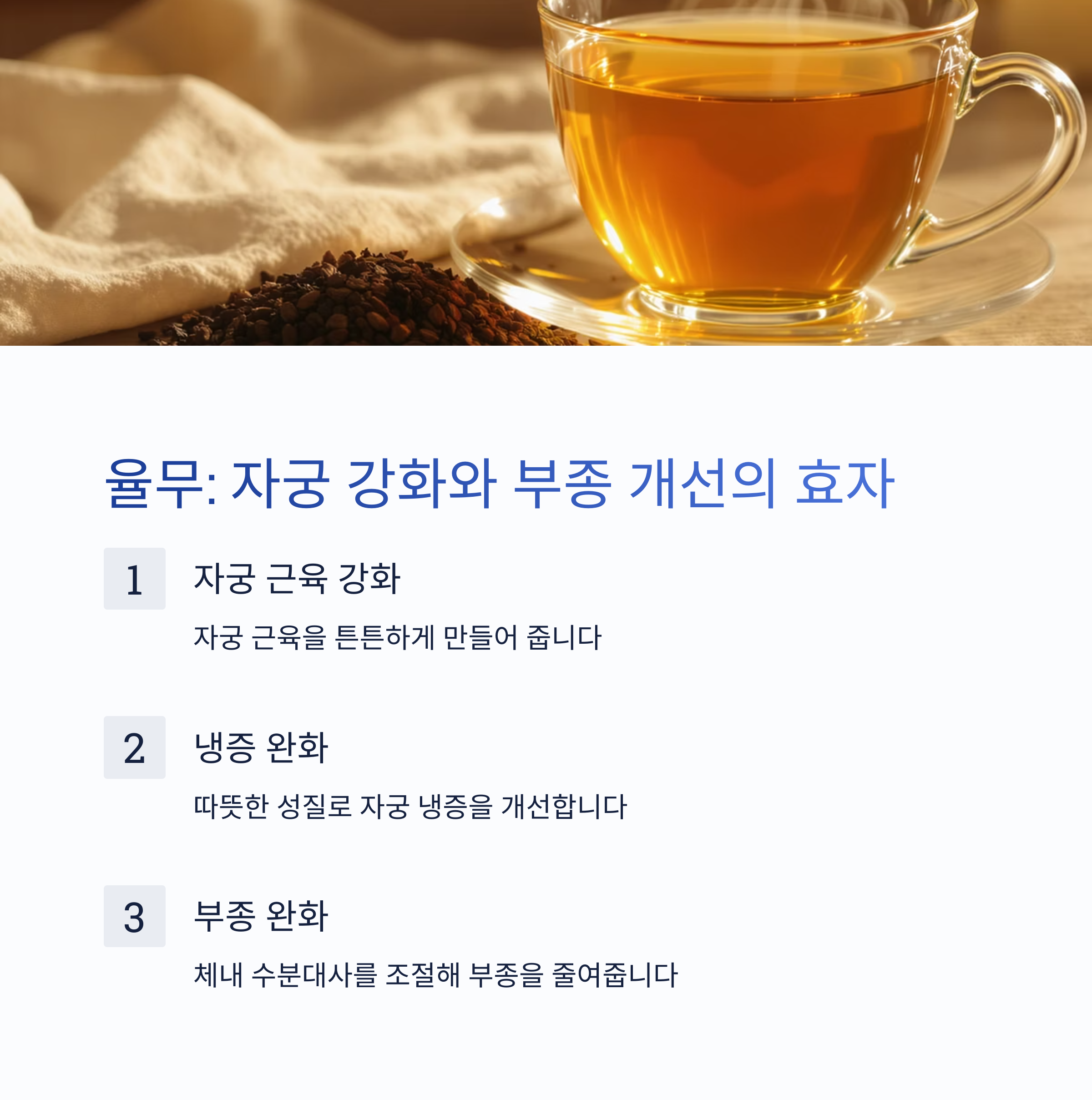 율무 | 자궁 강화, 냉증 완화 | 부종 개선, 면역력 증진 |