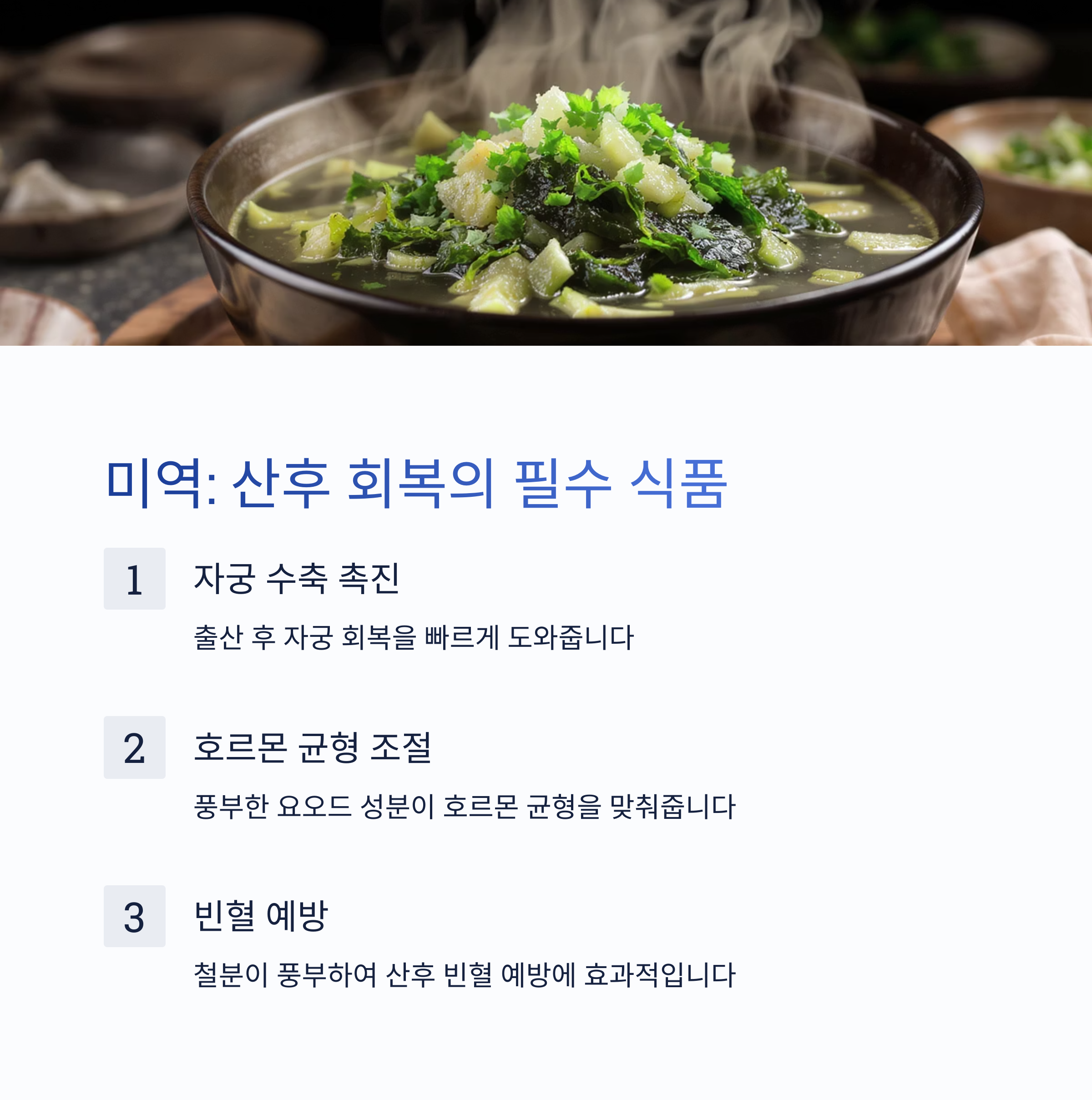 미역은 자궁 수축을 도와 산후 회복을 빠르게 하며,