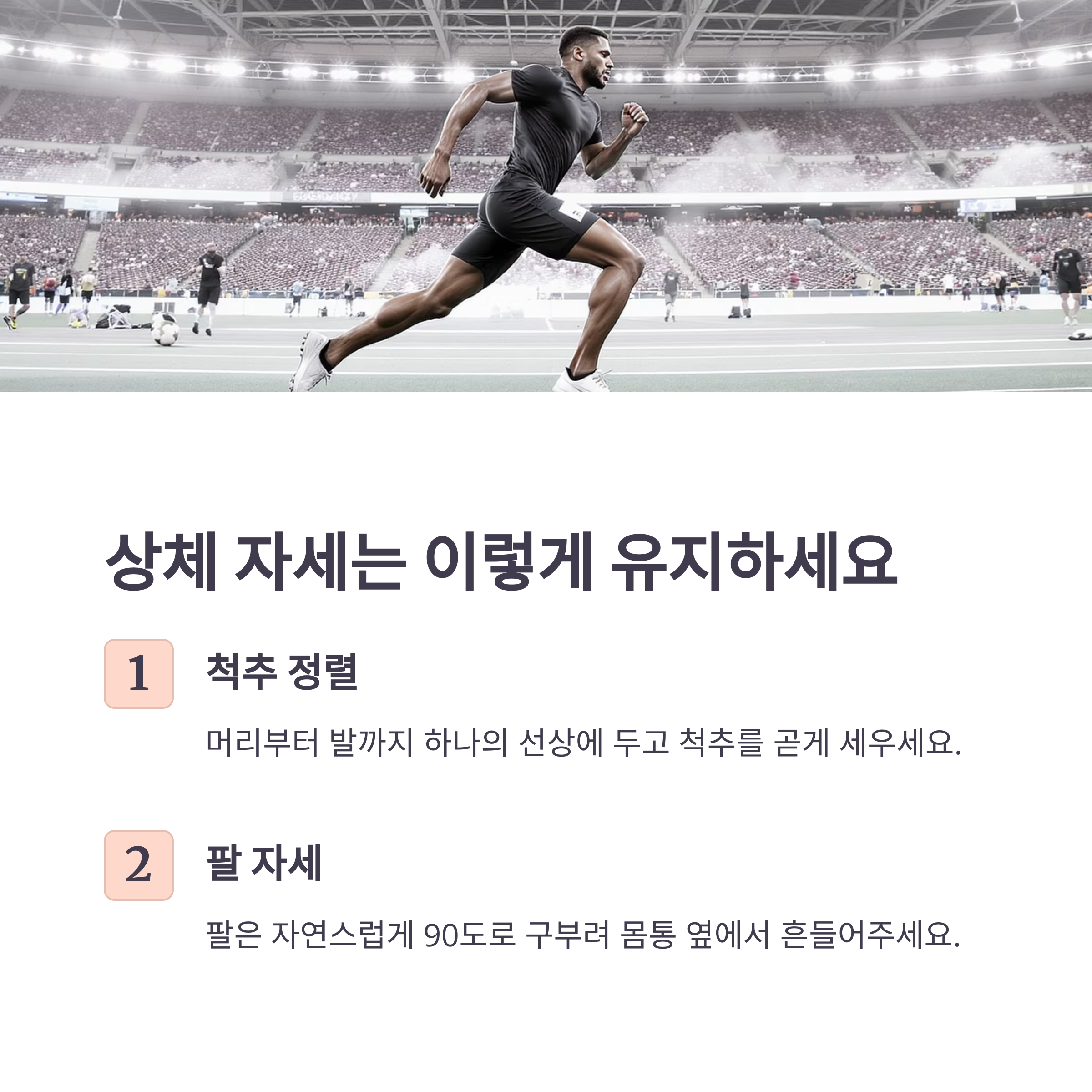 몸을 너무 앞으로 숙이거나 뒤로 젖히면 중심이 흐트러지며 부상 위험이 커집니다. 머리부터 발까지 하나의 선상에 있도록 척추를 곧게 세우고, 살짝 앞으로 기울이는 느낌으로 달리는 것이 좋습니다. 팔은 자연스럽게 90도로 구부려 몸통 옆에서 흔들어주세요.