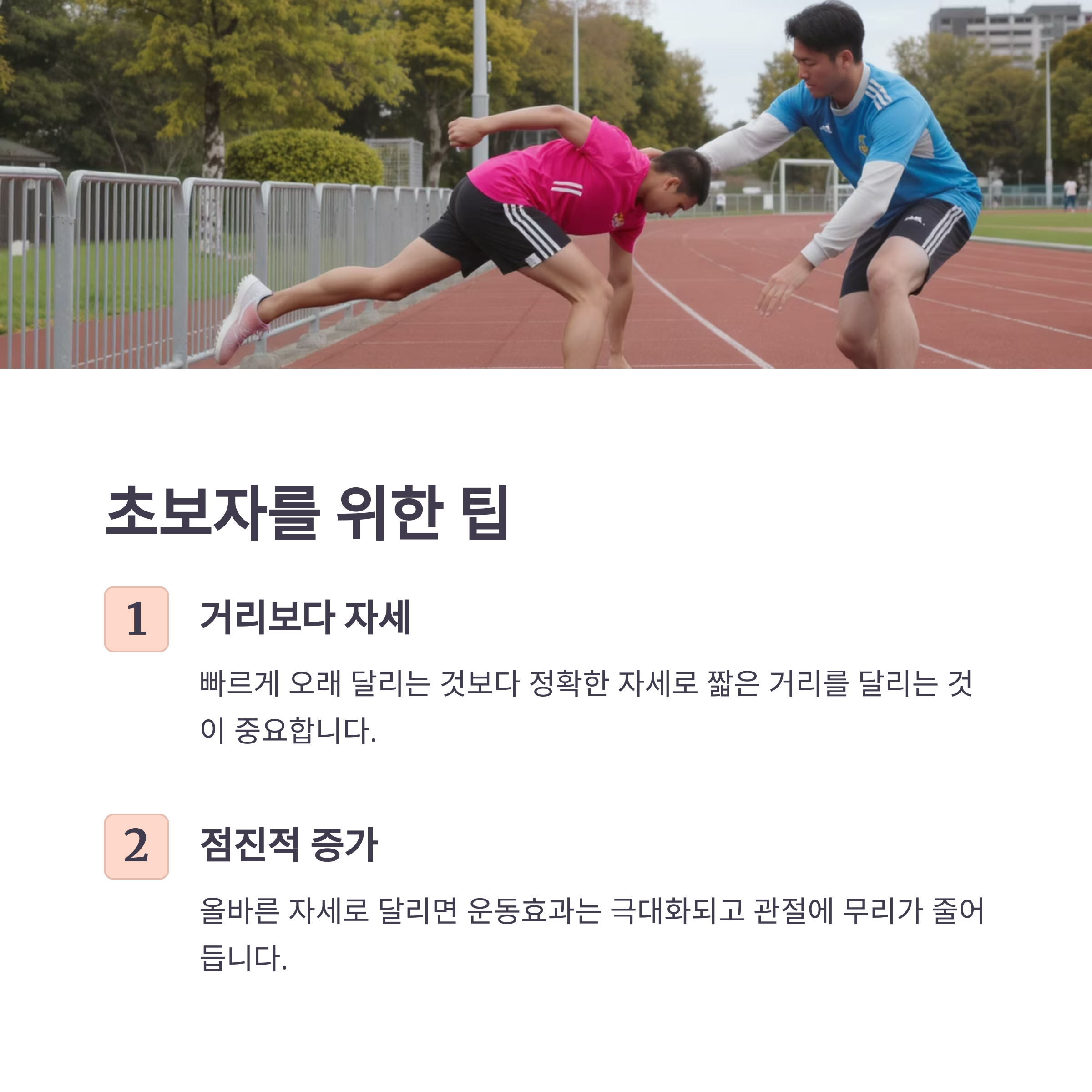 초반에는 빠르게 오래 달리는 것보다 정확한 자세로 짧은 거리를 달리는 것이 훨씬 중요합니다. 이렇게 하면 운동효과를 극대화하면서도 관절에 무리가 가지 않아 장기적으로 운동을 지속할 수 있습니다.