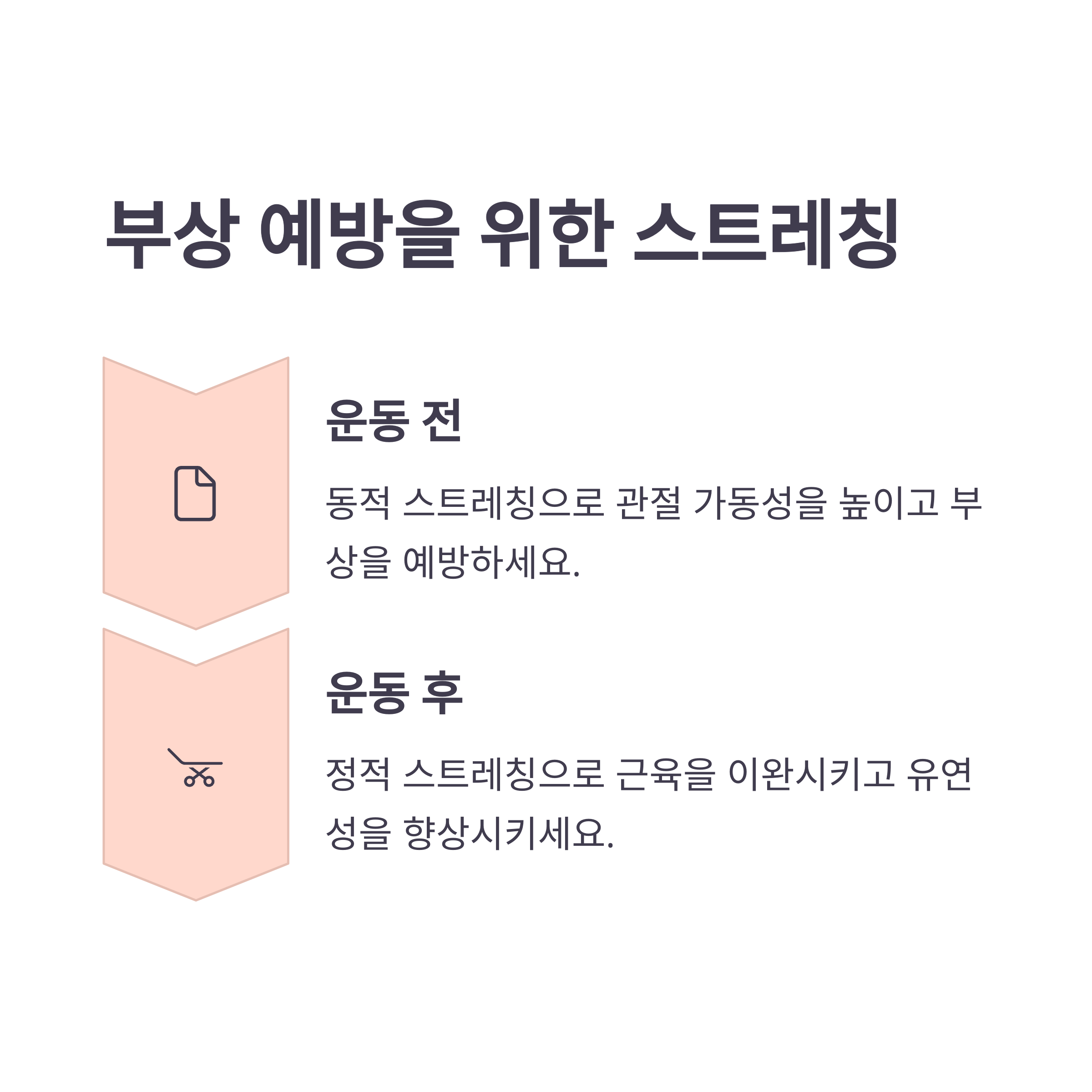 런닝 전에는 반드시 워밍업을 해줘야 합니다. 특히 무릎, 발목, 햄스트링 부위를 중심으로 동적 스트레칭을 실시하면 부상 확률이 크게 줄어듭니다. 운동 후에는 정적인 스트레칭을 통해 근육을 이완시키는 것도 중요합니다.