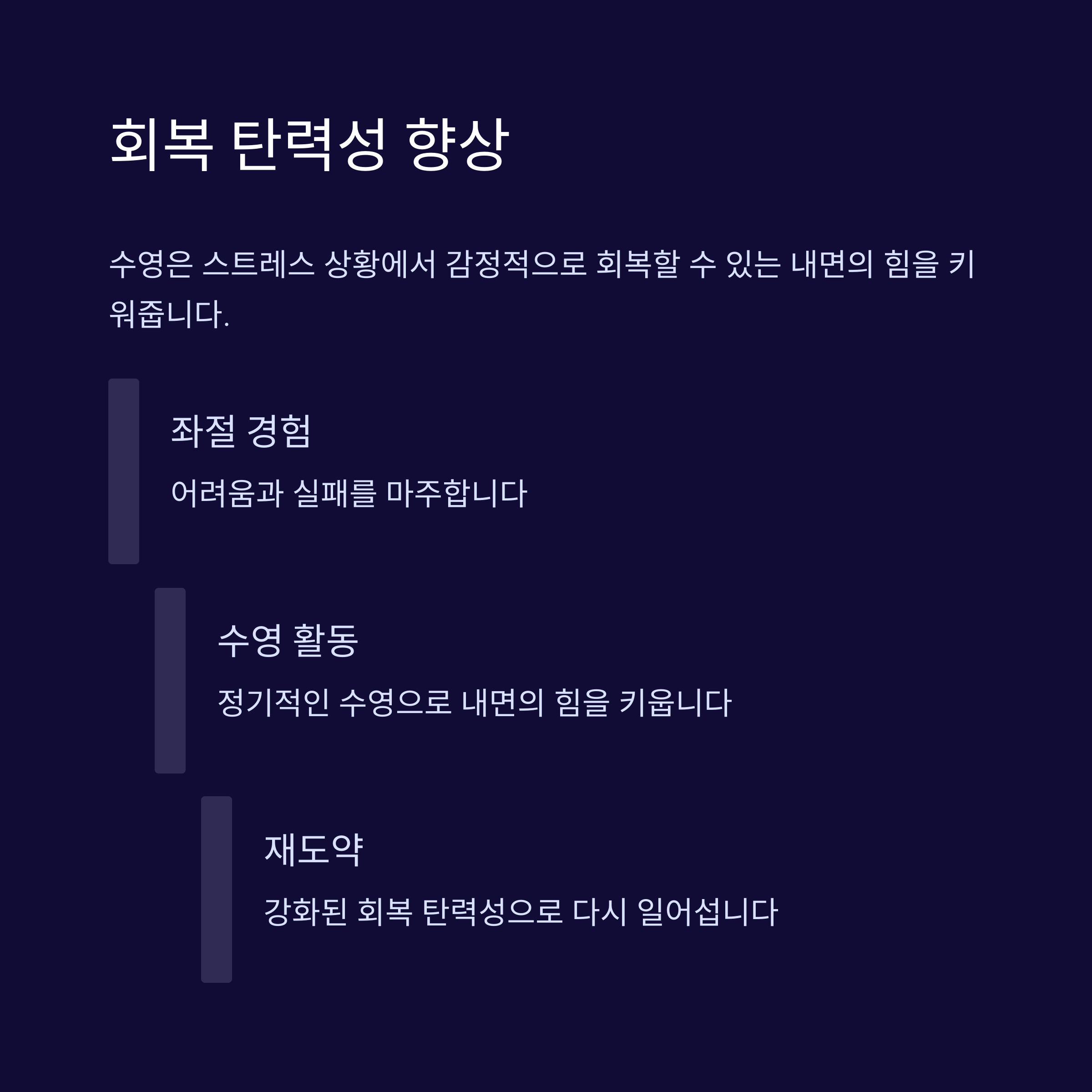 수영은 단순한 유산소 운동을 넘어 정신적 안정과 감정 조절에 큰 도움을 주는 운동입니다. 물속에서의 부유감, 일정한 호흡 리듬, 전신 운동의 조화가 뇌와 마음에 긍정적인 영향을 주며, 불안과 우울을 감소시키는 효과가 과학적으로 입증되고 있습니다. 이번 글에서는 수영이 정신건강에 어떤 놀라운 변화를 가져오는지 5가지 핵심 효과를 중심으로 살펴보겠습니다.