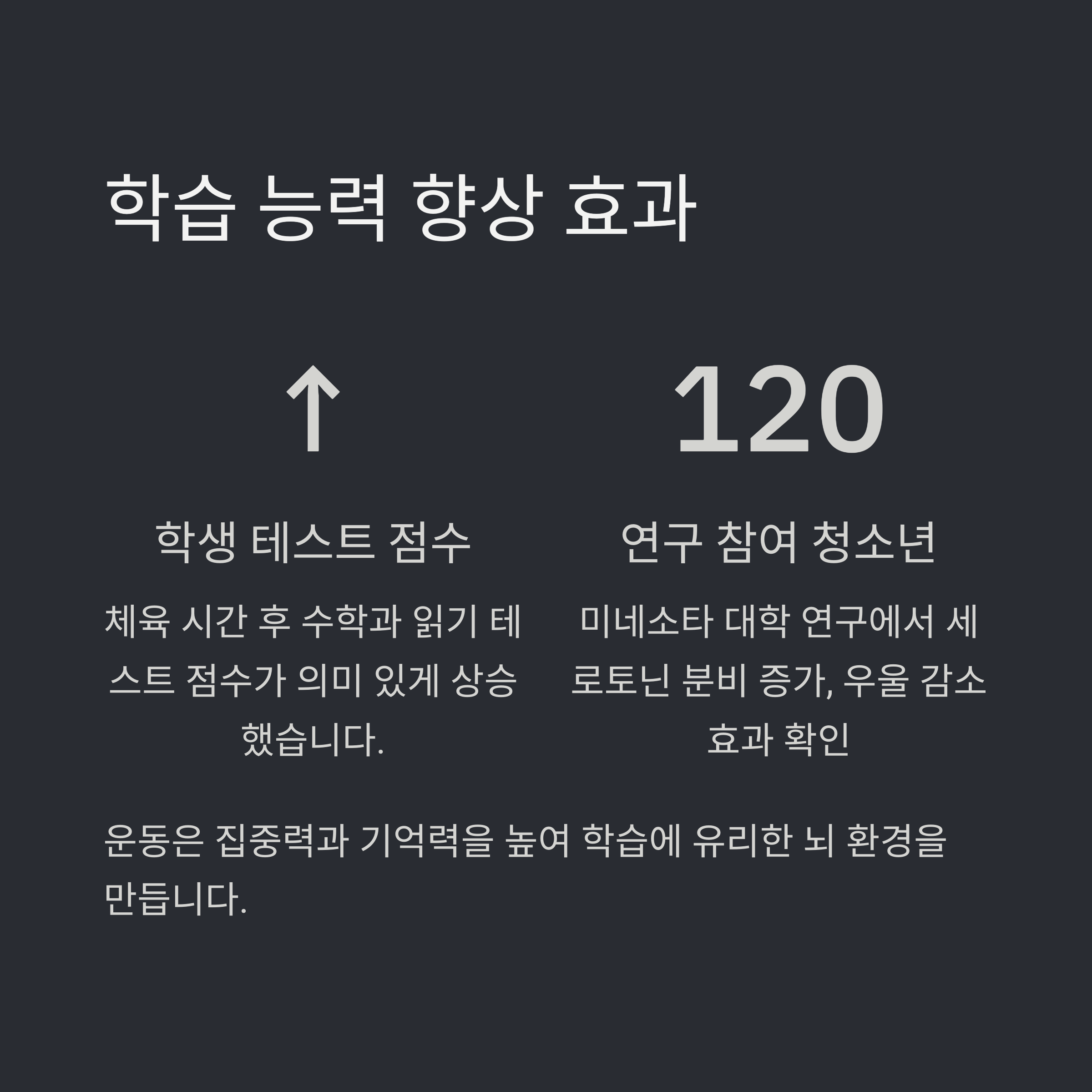 운동은 집중력과 기억력을 높여 학습에 유리한 뇌 환경을 만듭니다.