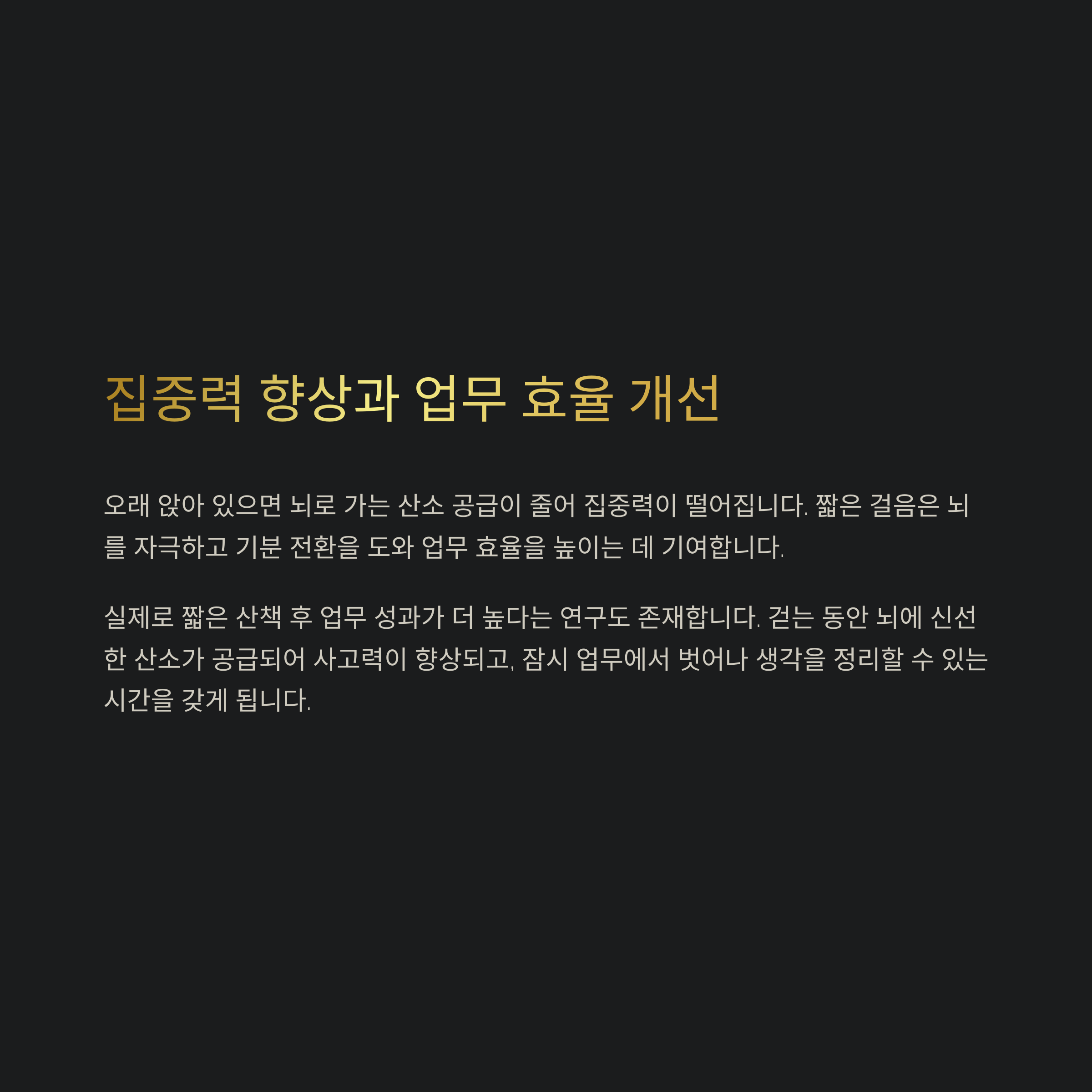 단 몇 분이라도 자리를 떠나 걷는 것은 뇌에 긍정적인 자극을 줍니다.
