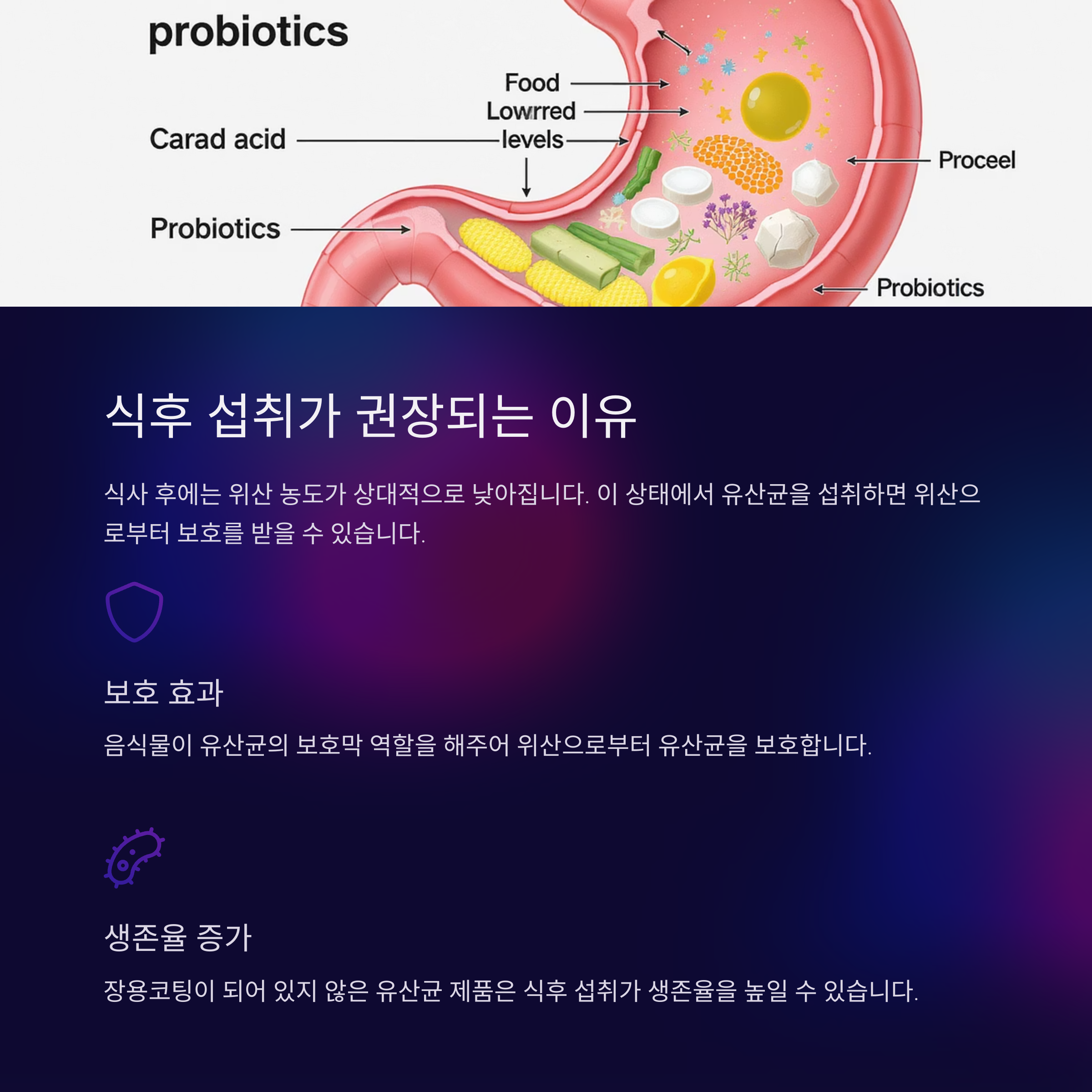 유산균은 살아 있는 미생물입니다. 장까지 안전하게 도달하기 위해서는 위산의 영향을 최대한 피하는 것이 중요합니다. 공복과 식후의 위산 농도 차이는 유산균 생존율에 큰 영향을 줄 수 있습니다.
