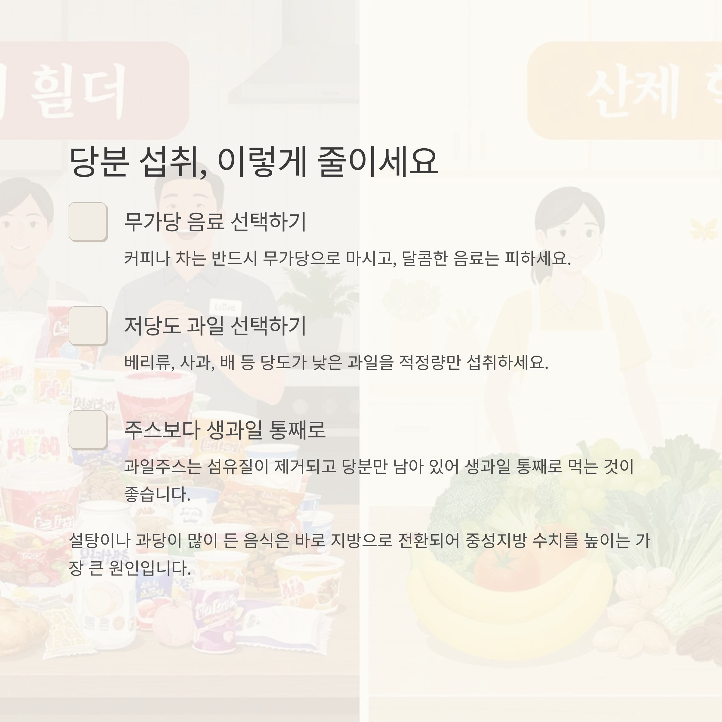 따라서 커피는 무가당으로, 과일도 당도가 낮은 종류 위주로 제한해서 섭취하는 것이 좋습니다.