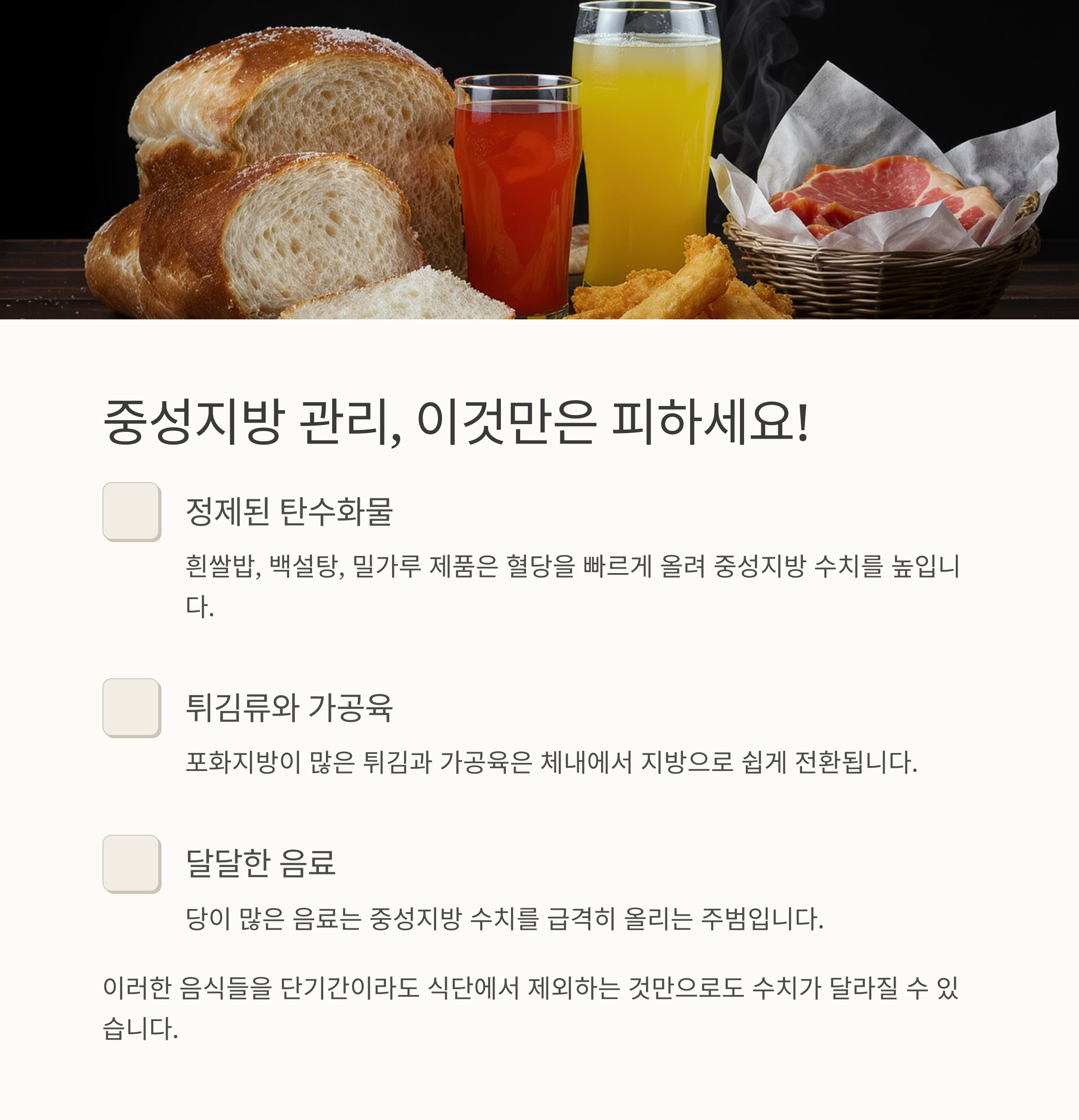 중성지방을 낮추려면 우선 피해야 할 식재료부터 점검해야 합니다.