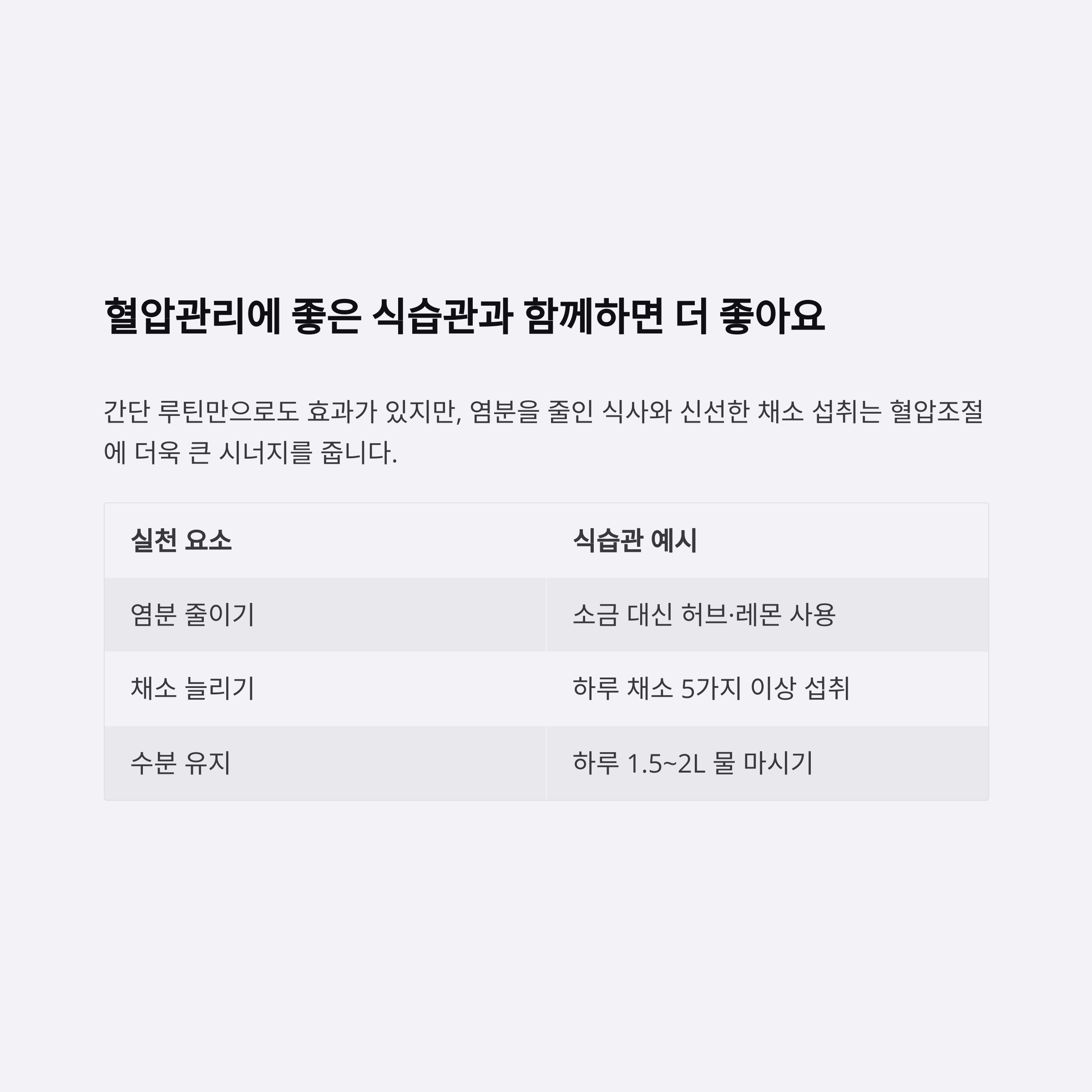 간단 루틴만으로도 효과가 있지만, 염분을 줄인 식사와 신선한 채소 섭취는