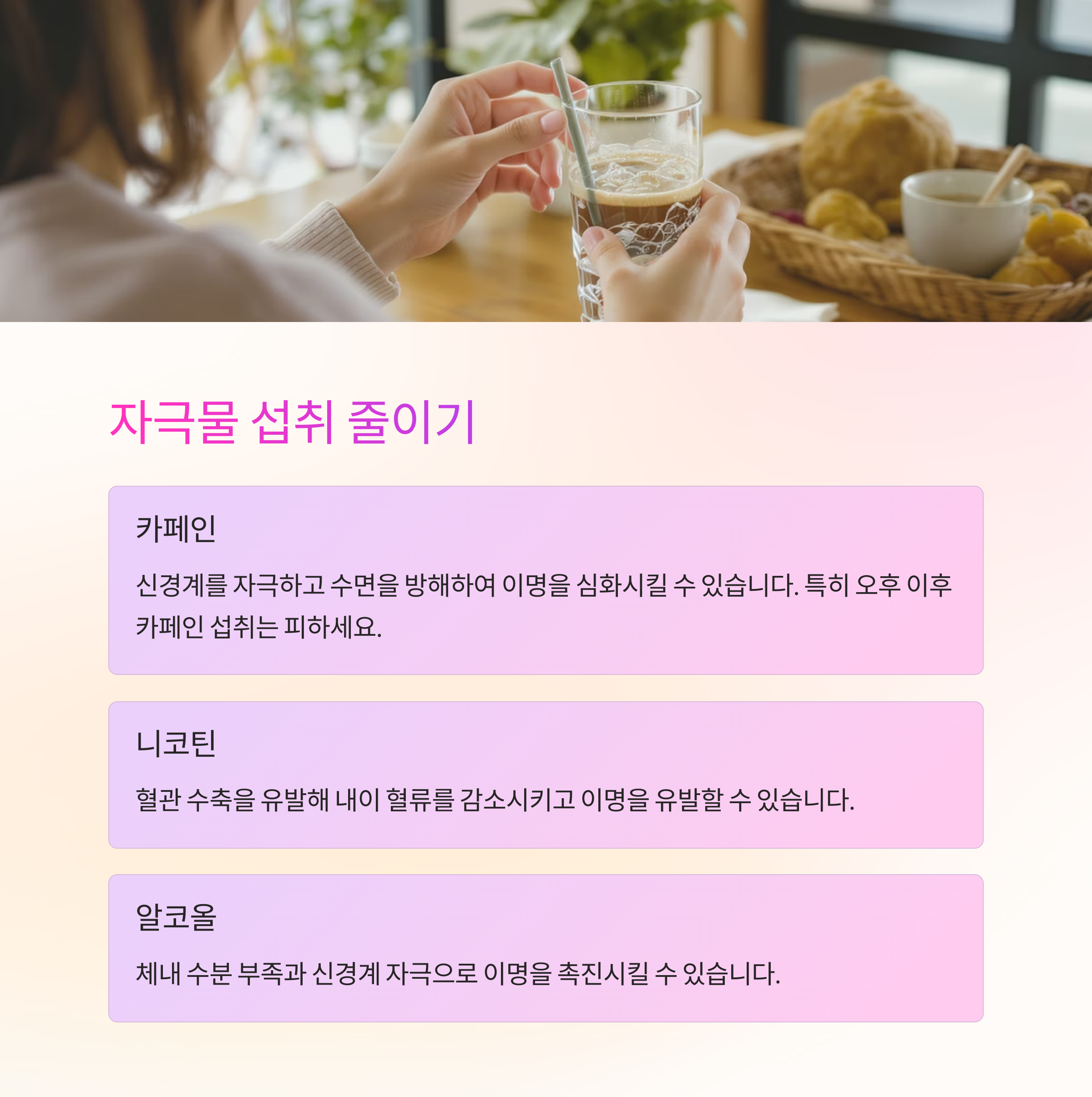 | 카페인 | 신경계 자극, 수면 방해로 이명 심화 가능성 증가 |
