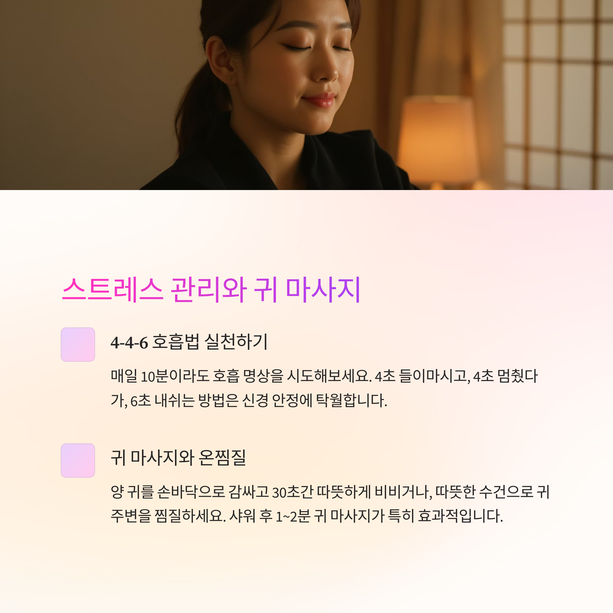 특히 샤워 후 1~2분 귀를 마사지하는 루틴이 추천됩니다.