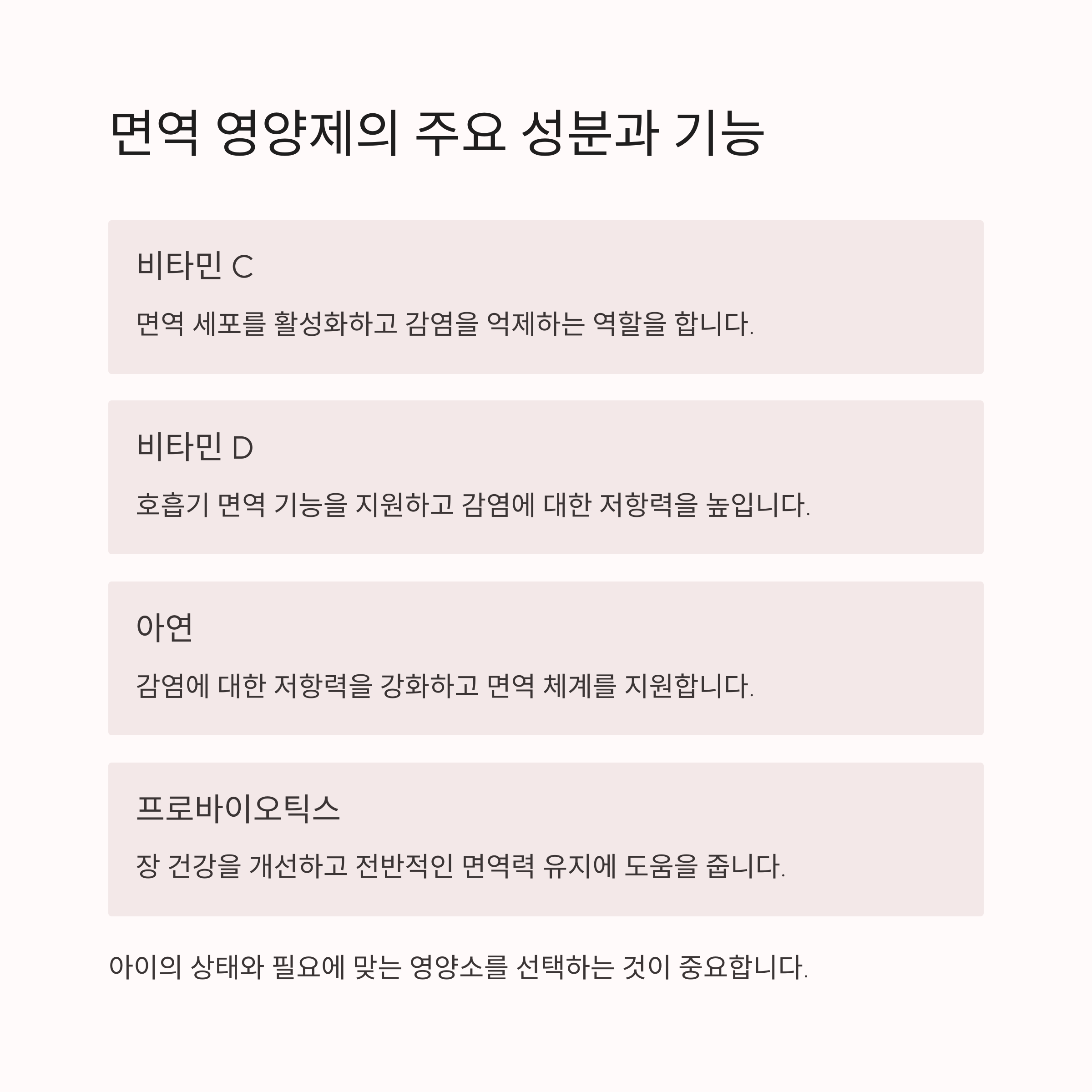 아래 표는 대표적인 어린이용 면역 영양제 구성 성분입니다.