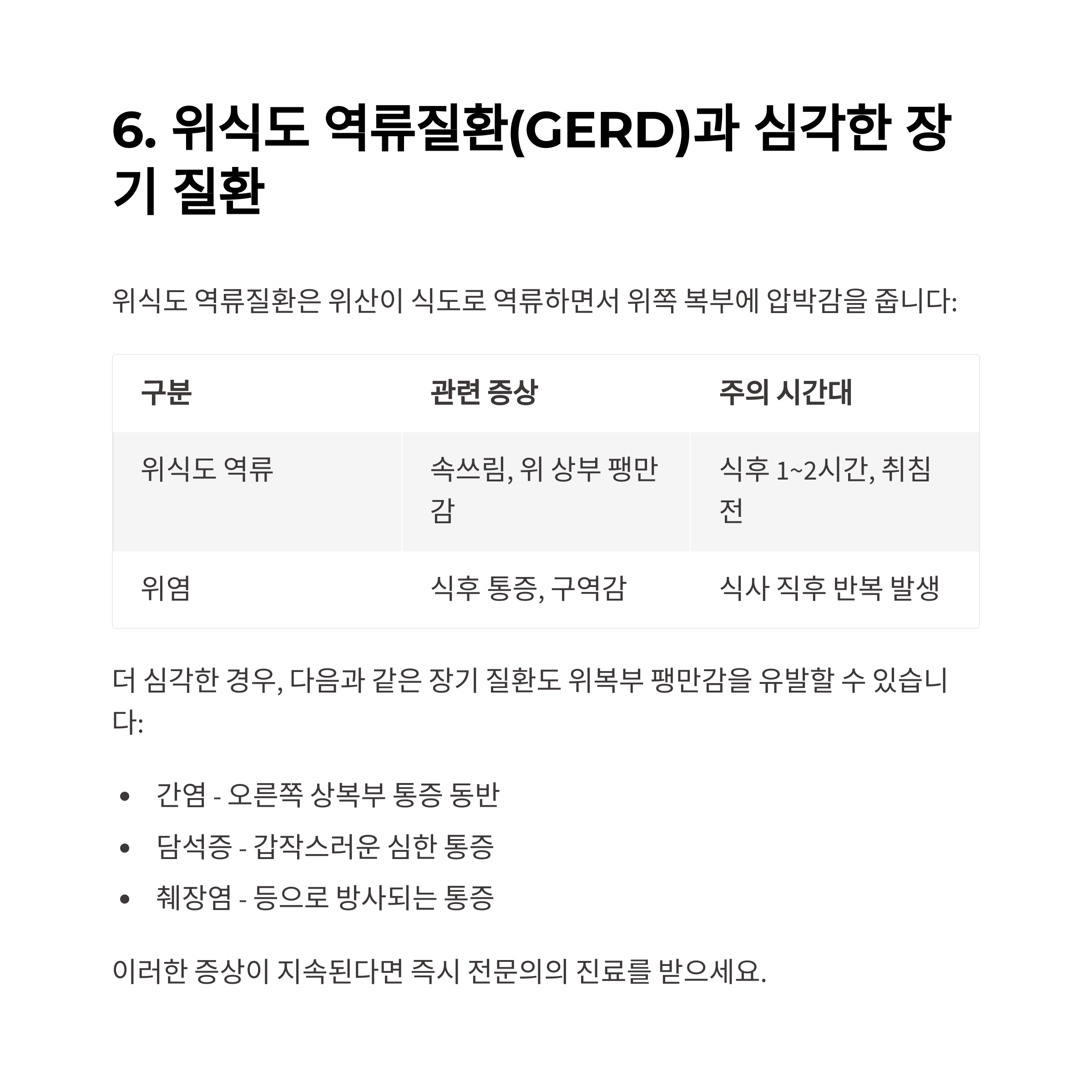 이 경우에는 소화기 문제가 없어도 팽만감이 반복될 수 있으며, 가볍게 운동하거나 따뜻한 찜질로 완화가 가능합니다.