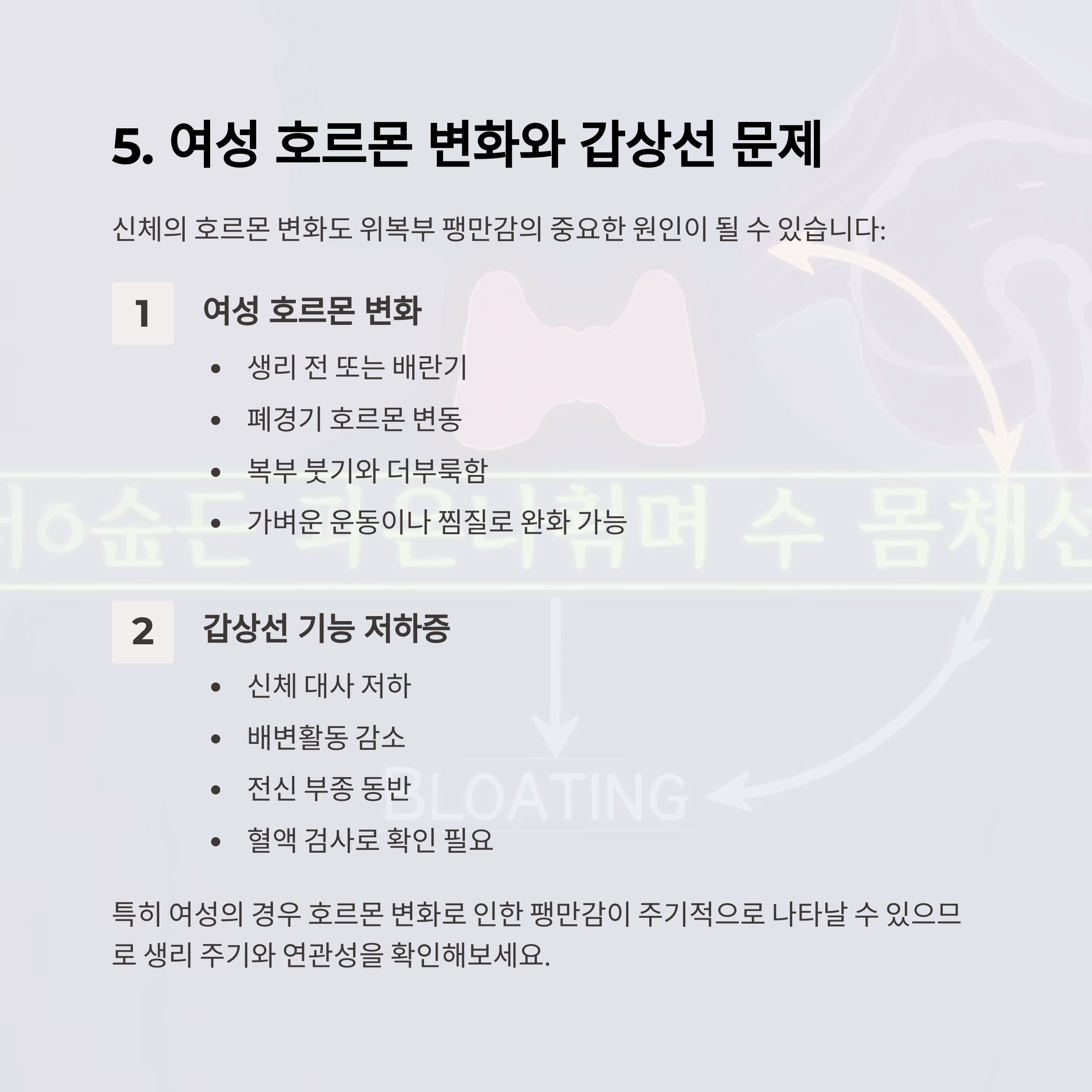 여성의 경우 생리 전이나 배란기, 또는 폐경기에 호르몬 변화로 인해 복부가 붓고 더부룩함을 느낄 수 있습니다.