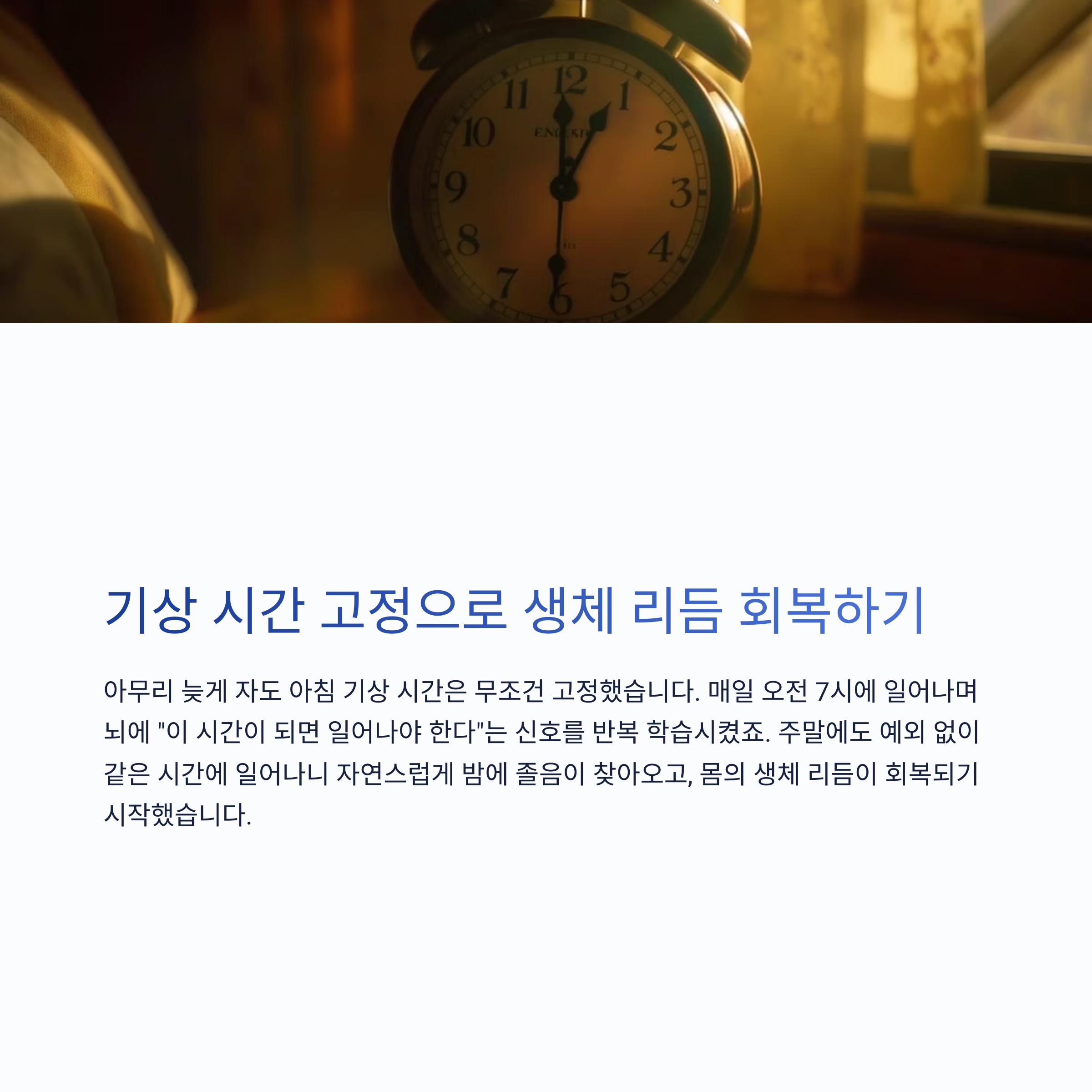 매일 오전 7시에 일어나며 뇌에 "이 시간이 되면 일어나야 한다"는 신호를 반복 학습시켰죠.