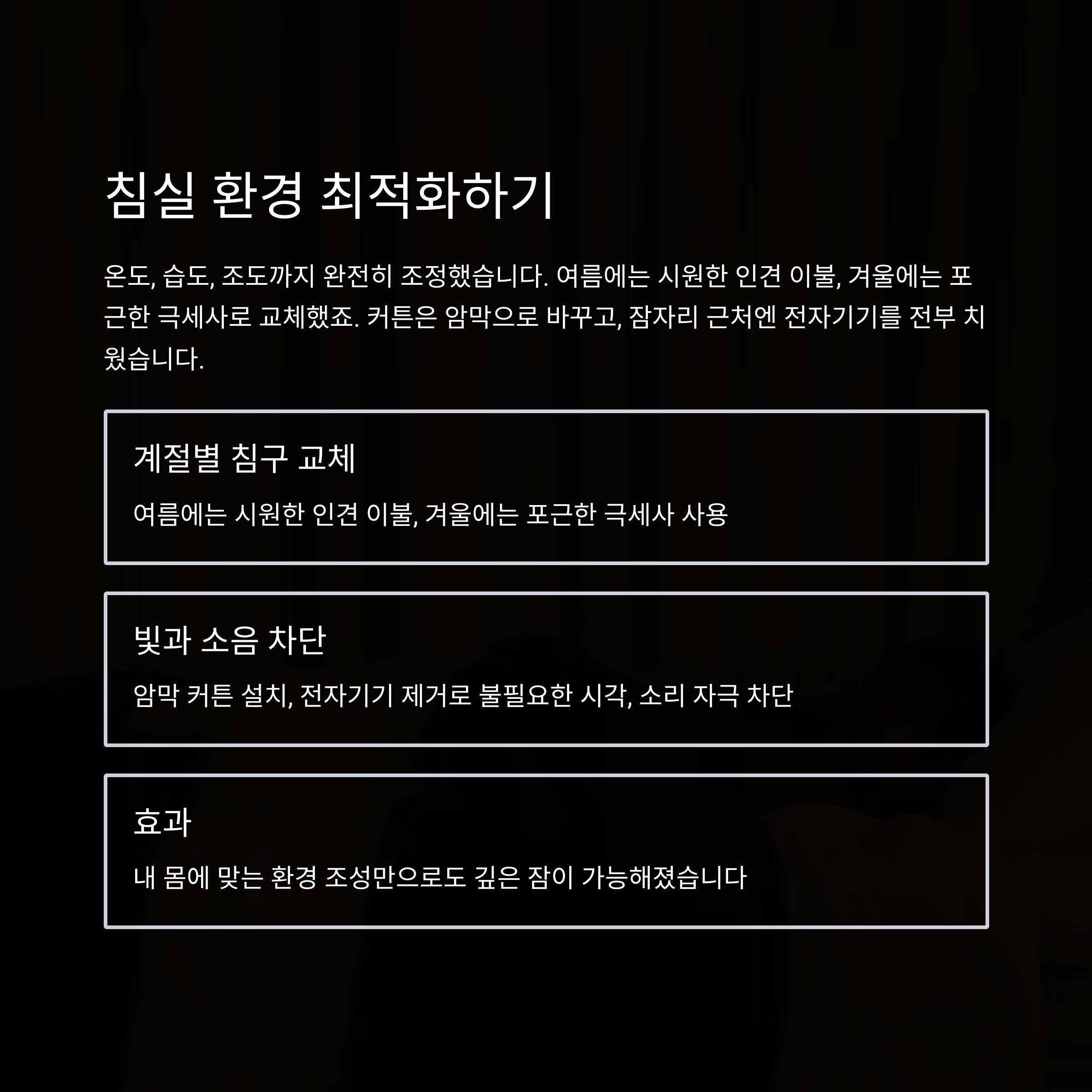 내 몸에 맞는 환경 조성만으로도 깊은 잠이 가능해졌습니다.