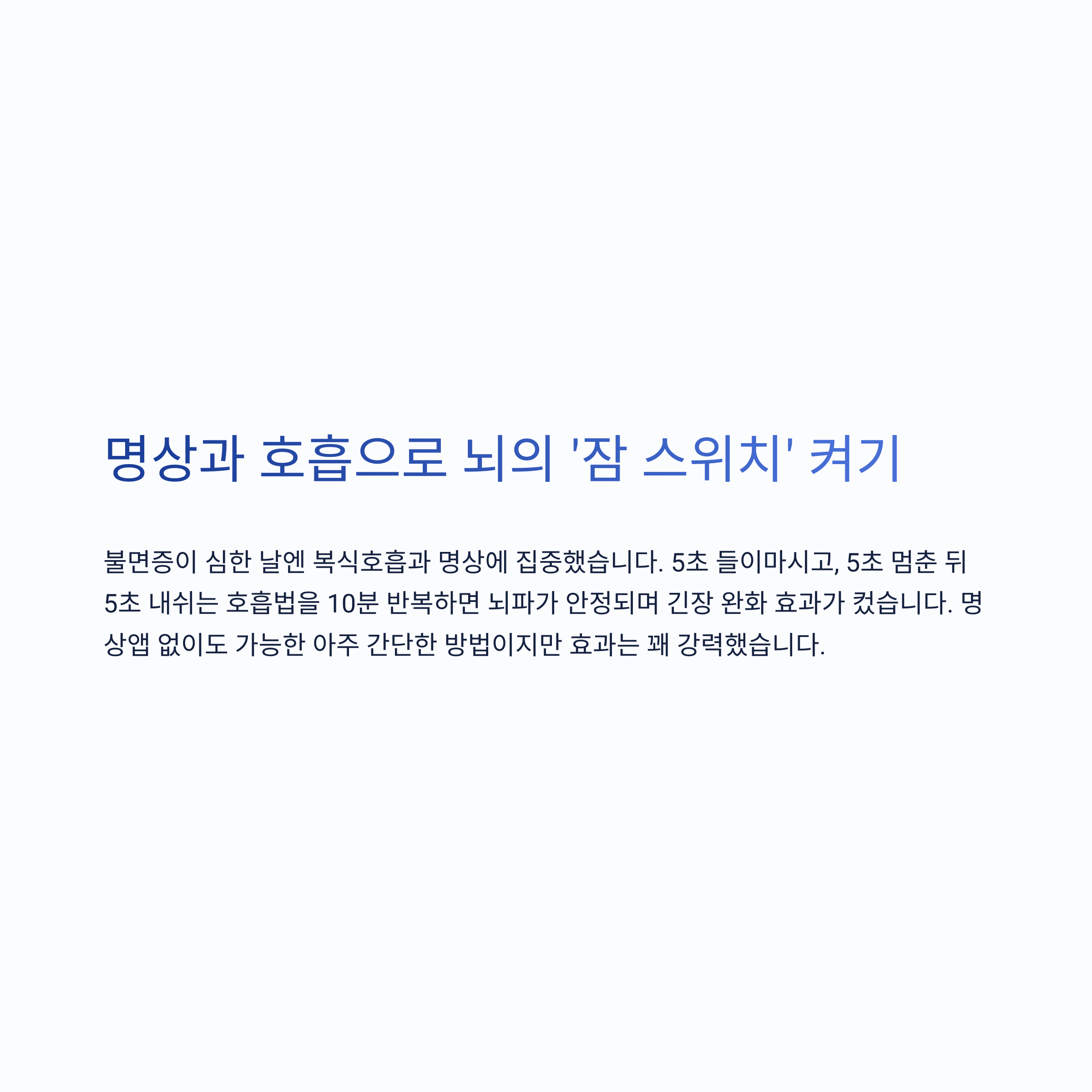 불면증이 심한 날엔 복식호흡과 명상에 집중했습니다.