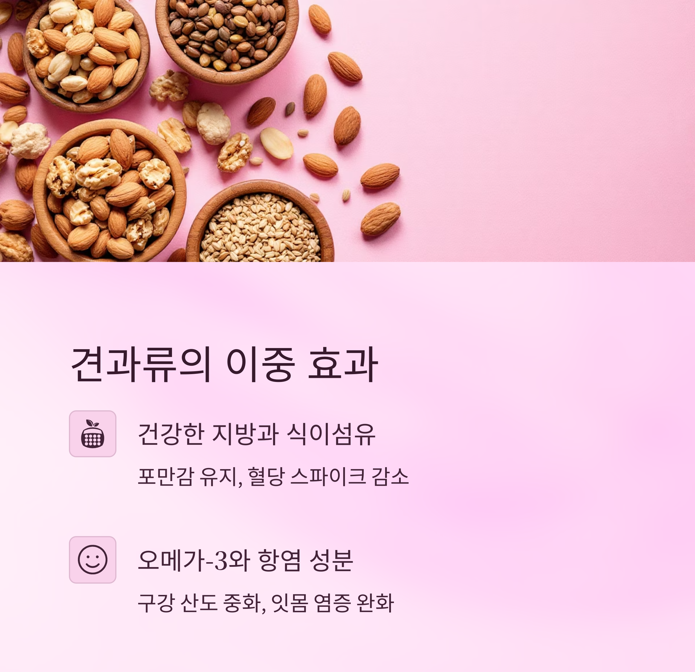견과류 | 산도 중화, 염증 완화 | 포만감 증가, 스파이크 방지 |