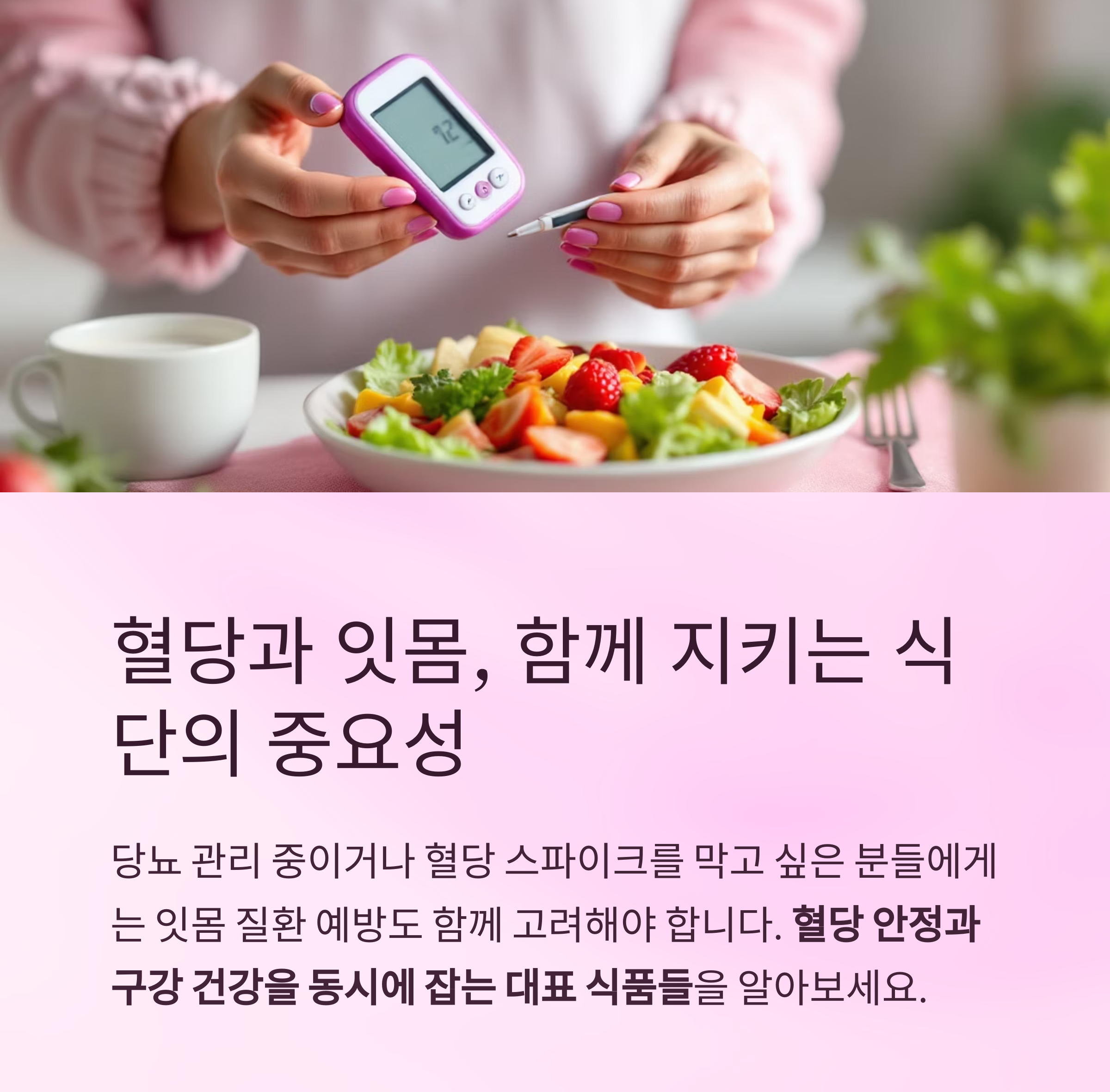 특히 당뇨 관리 중이거나 혈당 스파이크를 막고 싶은 분들에게는 잇몸 질환 예방도 함께 고려해야 합니다.