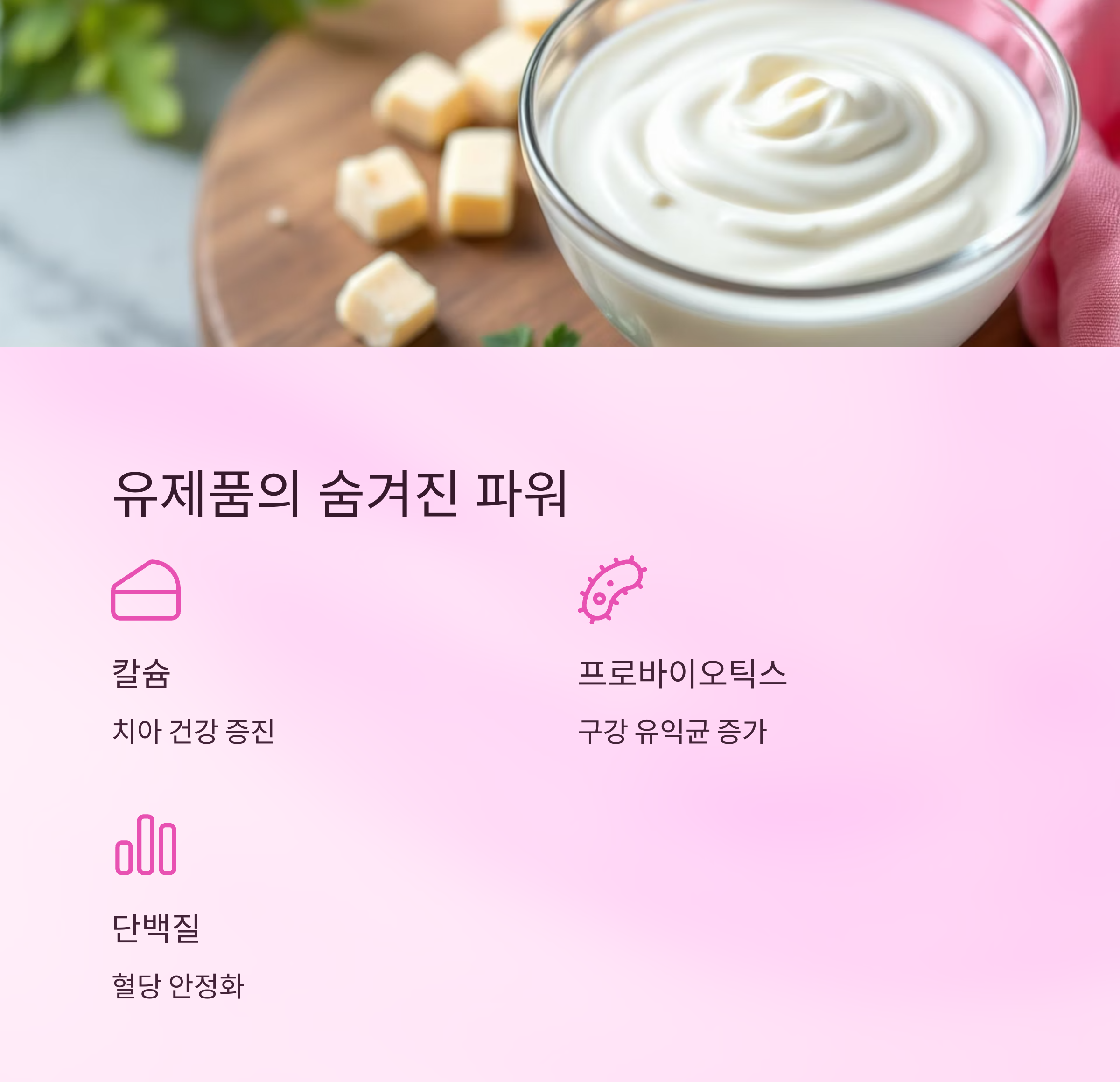 유제품 | 유익균 증가, 치아 강화 | 혈당 안정성 높음 |