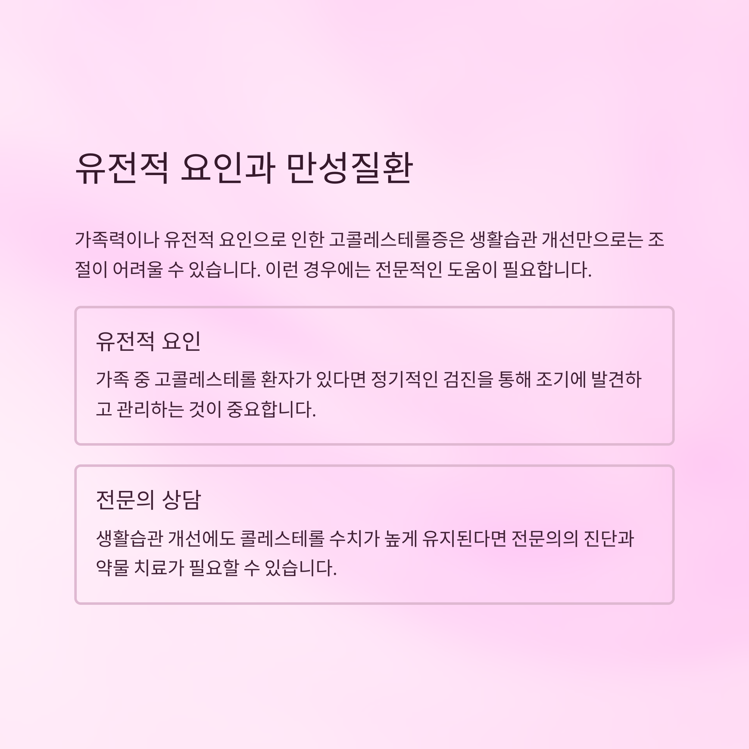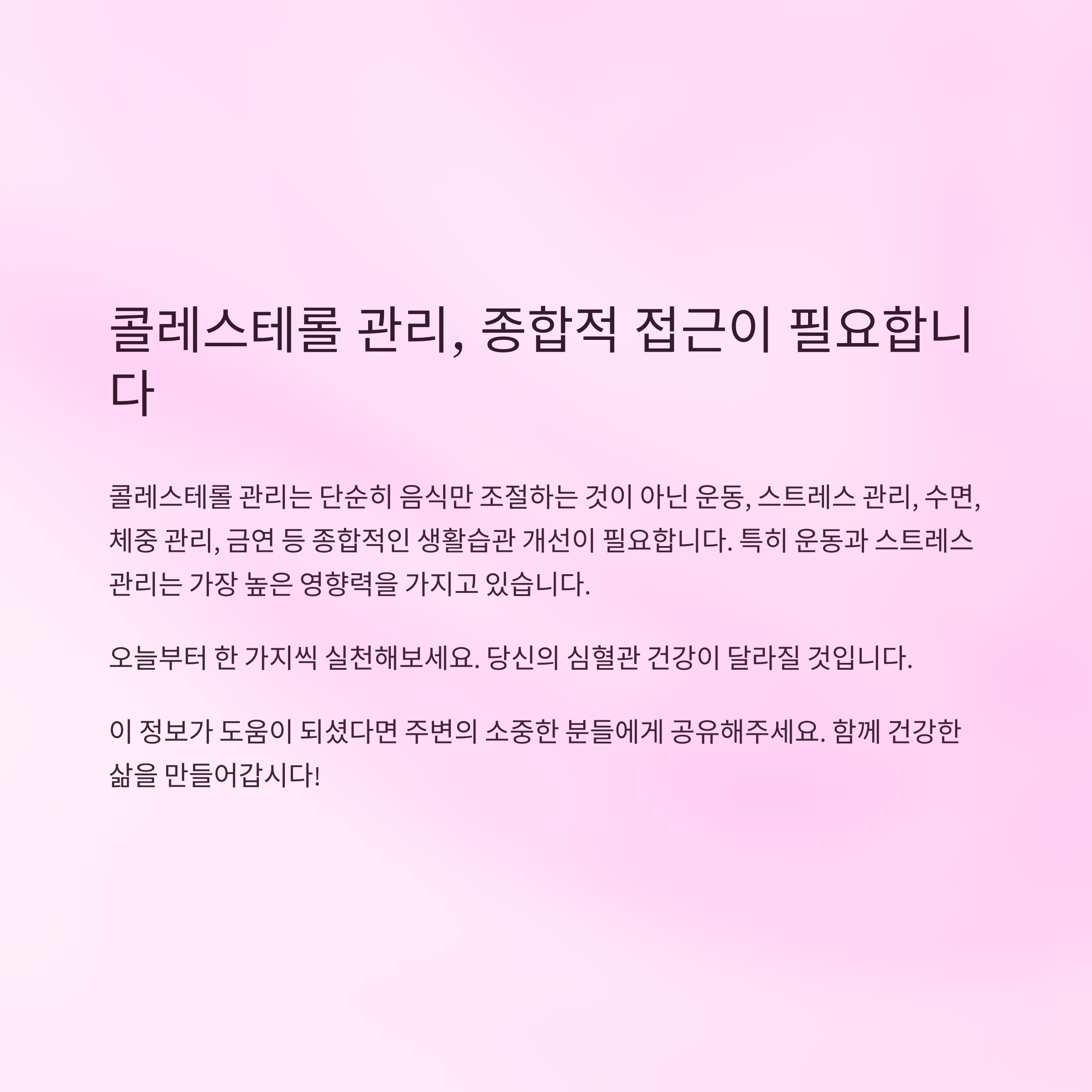 콜레스테롤 관리는 한 번의 노력으로 끝나는 단기 과제가 아니라, 평생 이어가야 하는 장기 프로젝트라는 점을 기억해야 합니다.