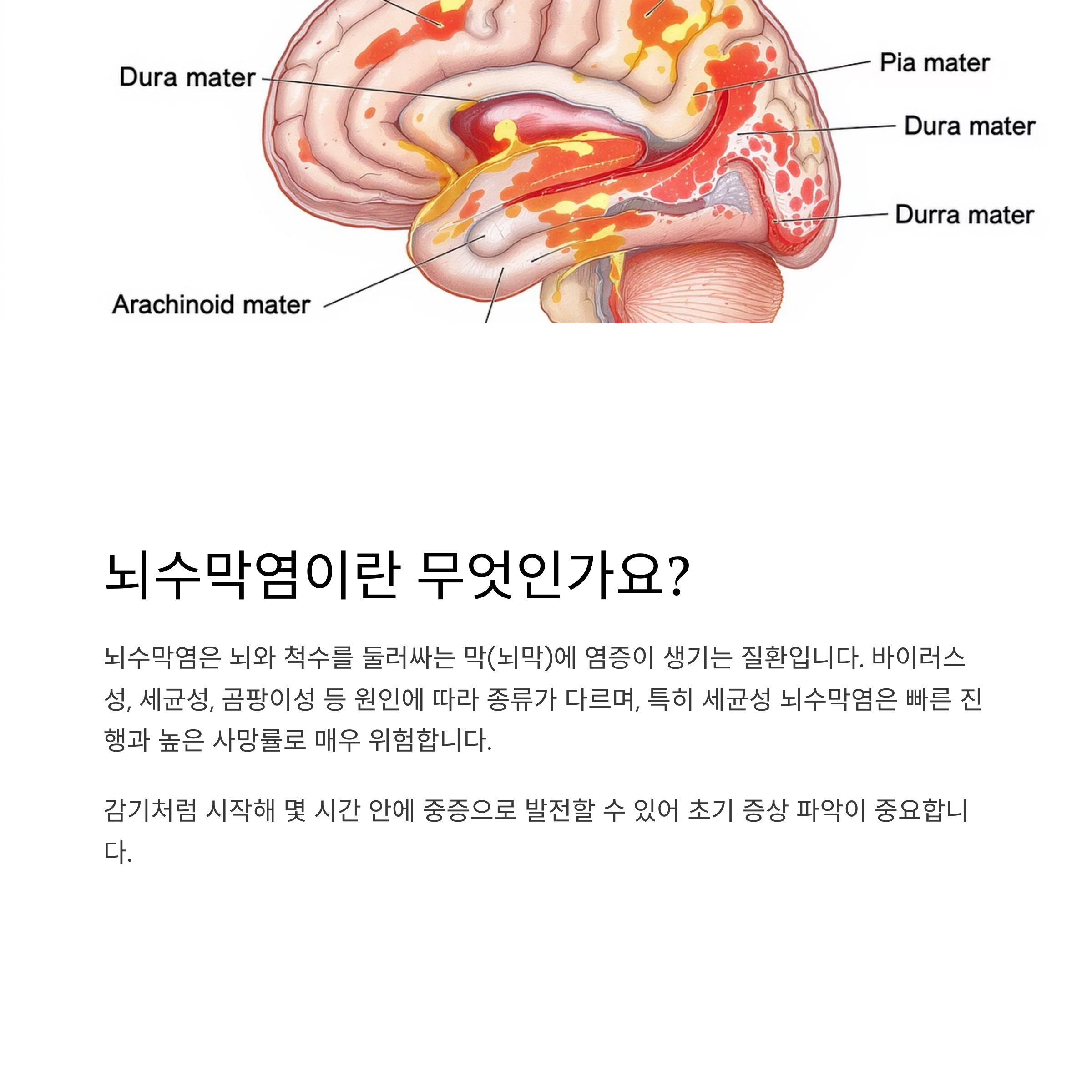뇌수막염은 뇌와 척수를 둘러싸는 막(뇌막)에 염증이 생기는 질환입니다.
