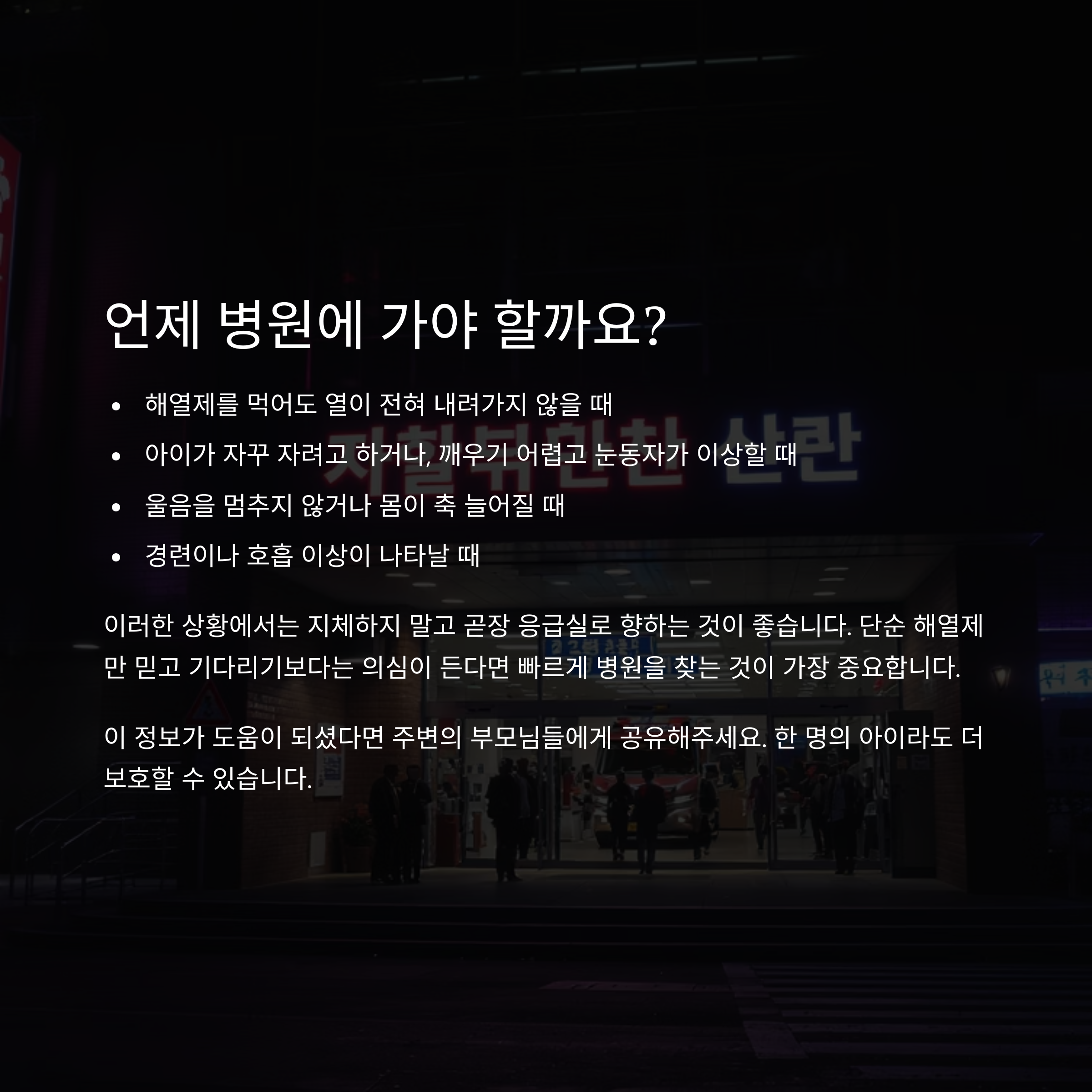 단순 해열제만 믿고 기다리기보다는 의심이 든다면 빠르게 병원을 찾는 것이 가장 중요합니다.