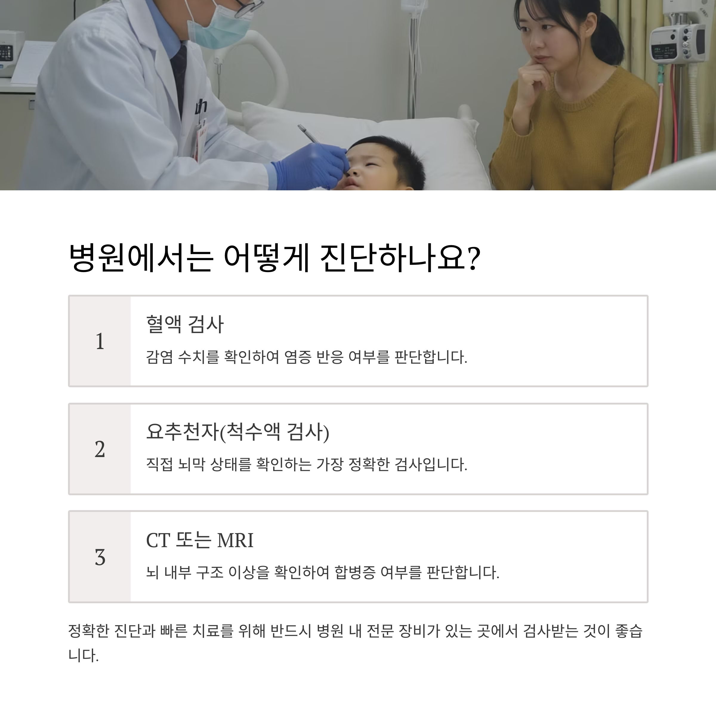 의심 증상이 있을 경우, 병원에서는 다음과 같은 과정을 통해 뇌수막염 여부를 진단합니다.