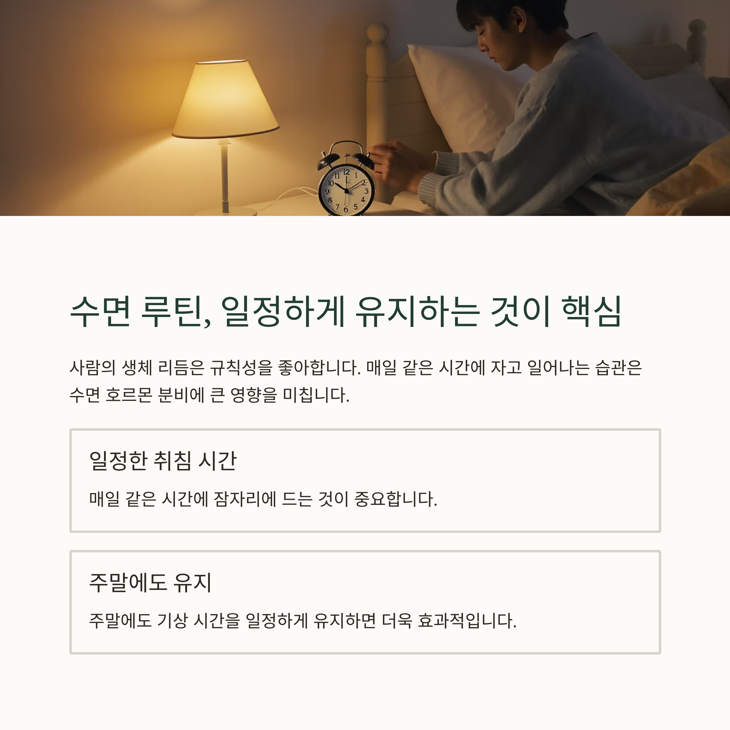매일 같은 시간에 자고 일어나는 습관은 수면 호르몬 분비에 큰 영향을 미칩니다.